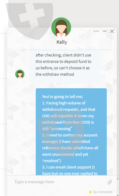 我提款“失败”。 “来自实时聊天的凯利”给出的原因是“经过检查,客户之前没有使用此入口向我们存入资金,因此不能选择它作为提款方式”。废话我当时使用电汇方式存入澳大利亚联邦银行,该银行目前没有作为提款的选项。因此,从根本上说,USG表示,由于我不再可以通过“入金”作为存款的提款方式,所以我不会永远提取我的钱,而USG可以公开骗取我并从中骗取钱财吗?