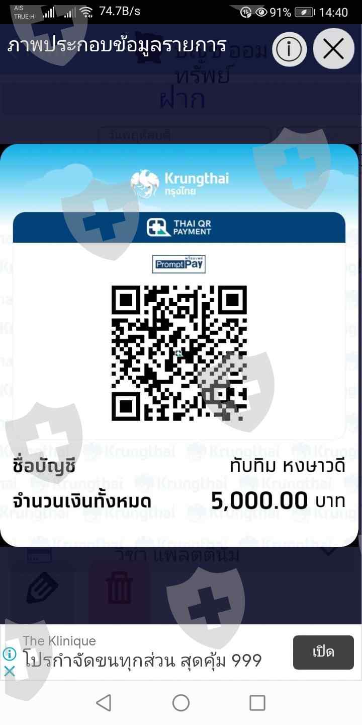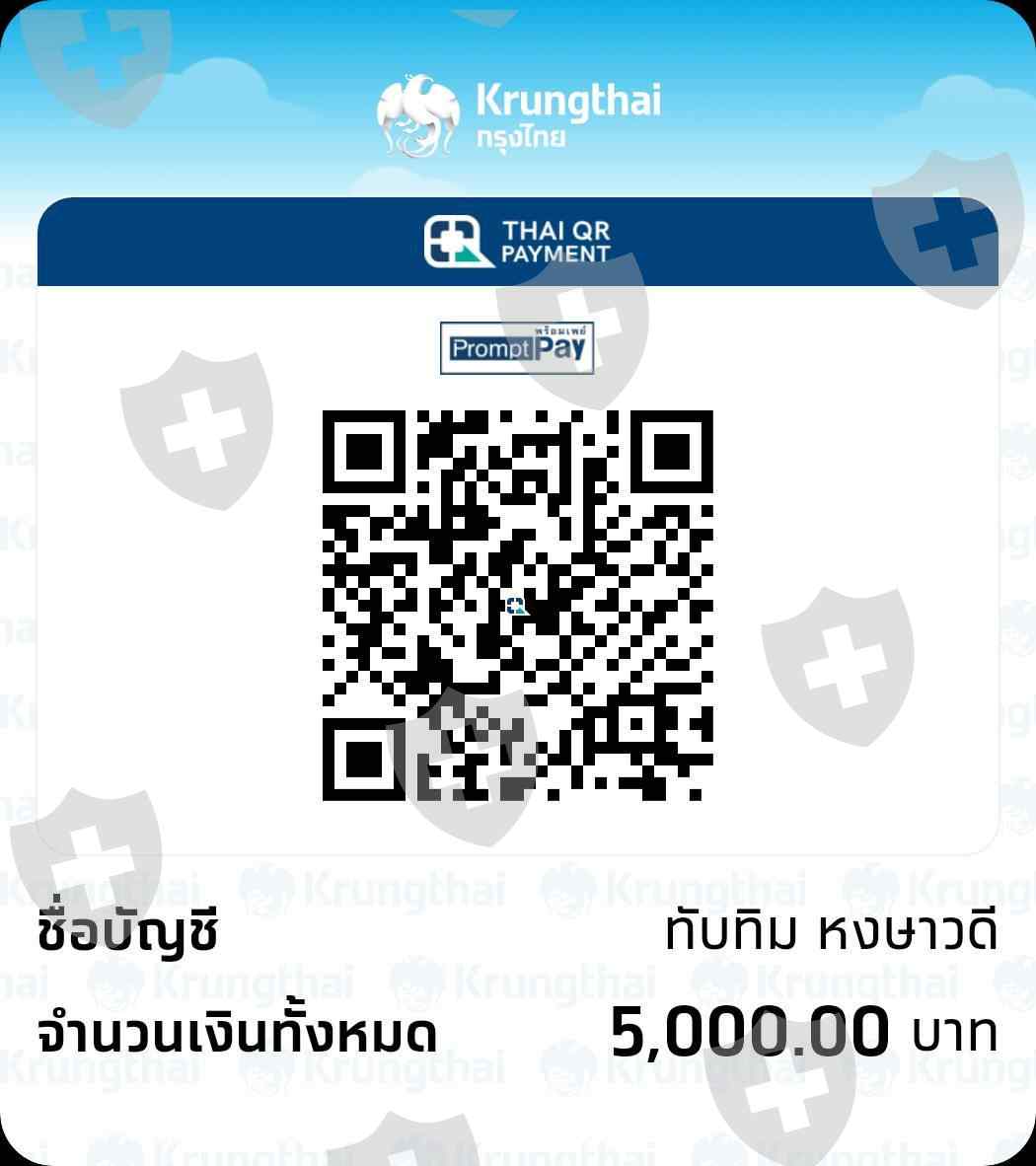 将钱提取到Krungthai银行帐户中,自动储蓄4770289278,通过PromptPay,帐号,帐户名Tubtim Hongsa女士获得6,000