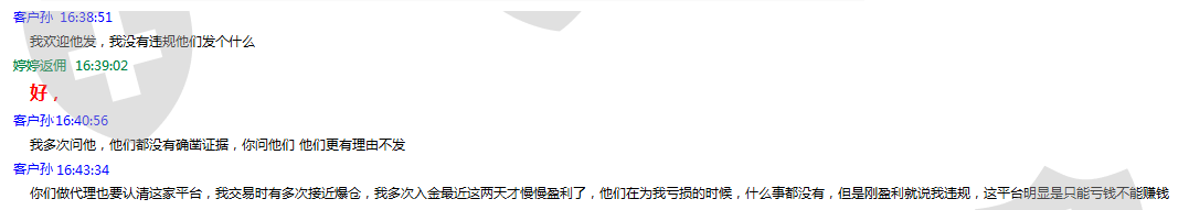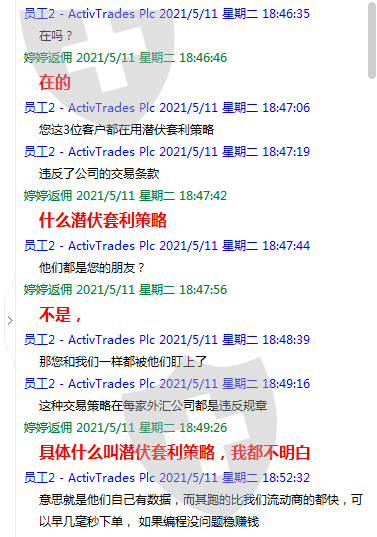 大家好,我这边是婷婷返佣,和ActivTrades平台合作以有一段时间,期间开发了几个客户,最近平台说客户违规交易,客户说自己是正常交易,那到底谁说的是事实呢?目前平台已经扣除客户盈利和我的佣金,客户的佣金前期我已经垫付13000元左右。下面图片是和平台,客户的聊天记录,请不要转发,谢谢,