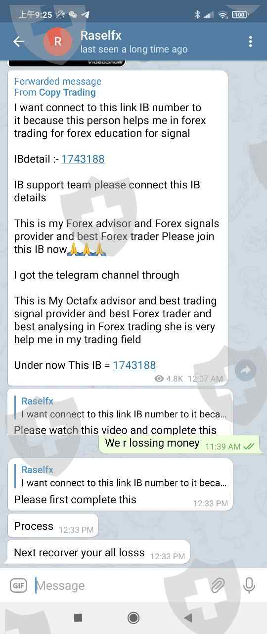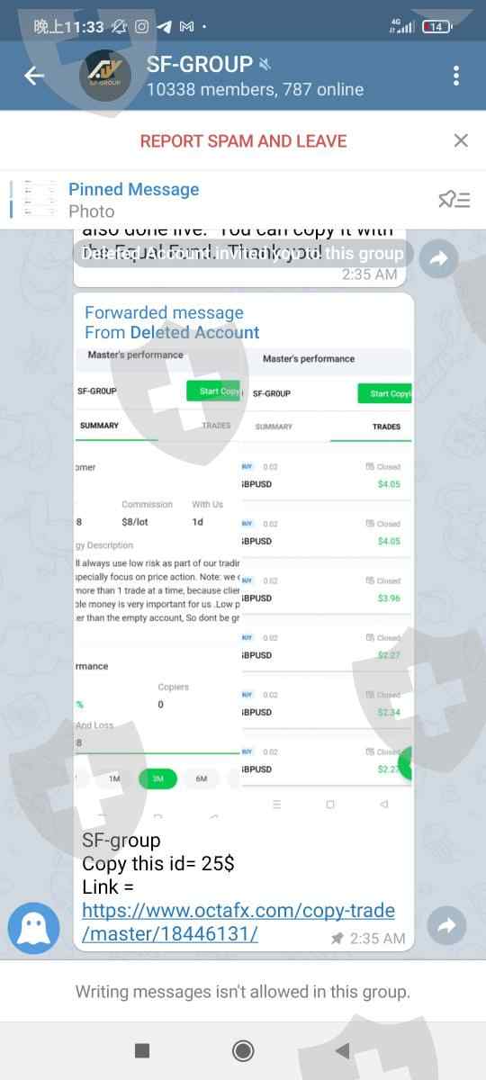 Octafx 的复制交易 (copy trading)的多数操盘手经常会故意赚几个小钱,然后亏几个大钱,最后甚至直接爆仓了。有的甚至会威胁你加入他的ib,说如果你加入他就帮你赚回来,不加入就继续亏损。