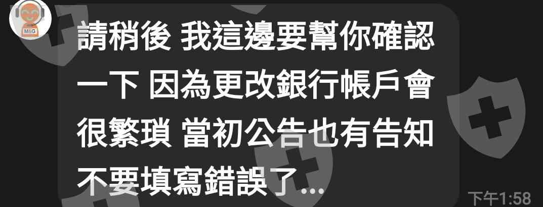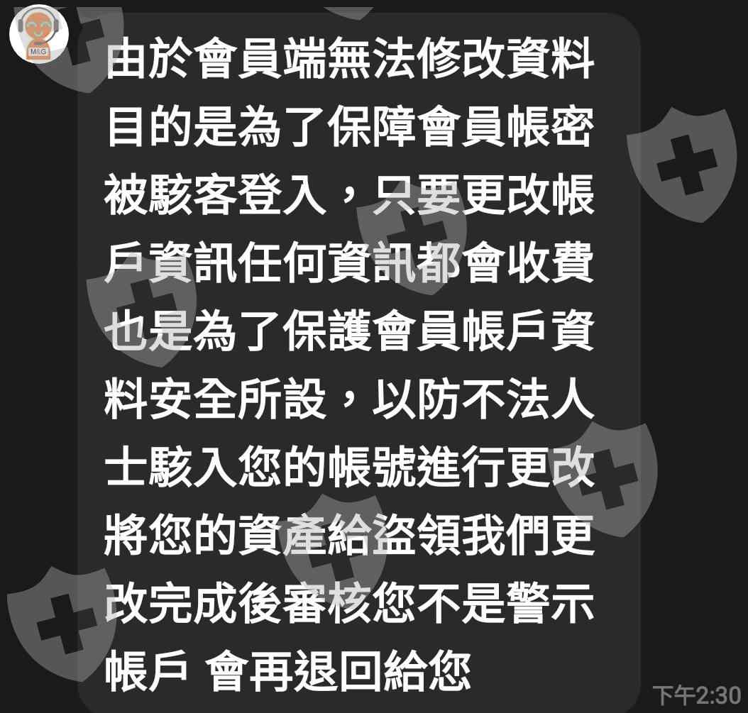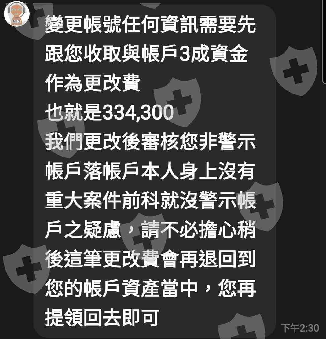 只要看到這網頁mginvestmentstw.net/ 不管前面有啥英文 他們都是一樣的網頁都是可以登入 一樣明明輸入對的銀行帳戶 但網頁顯示錯的 跟改還要是資金的3成才能更變 感覺一受騙 呼籲大家只要看到以上這網頁 基本不要去做投資 有入沒有出