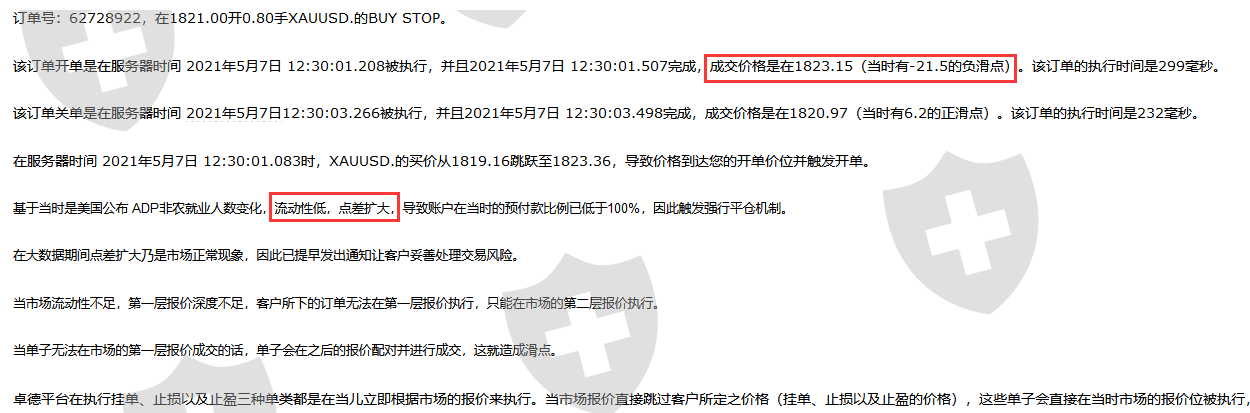 2021年5月7号非农夜,挂单0.8手buystop,挂单价格1821,止盈价格1826,结果成交价格为1823.15,并在价格回调至1820.97时账户爆仓。如果没有滑点,在1821成交,根本不可能会在1820.97时爆仓,并且可以在1826顺利止盈。平台回复说是流动性不足导致,不予赔偿。如果连0.8手的订单都能流动性不足的话,这样的平台还有什么存在意义?