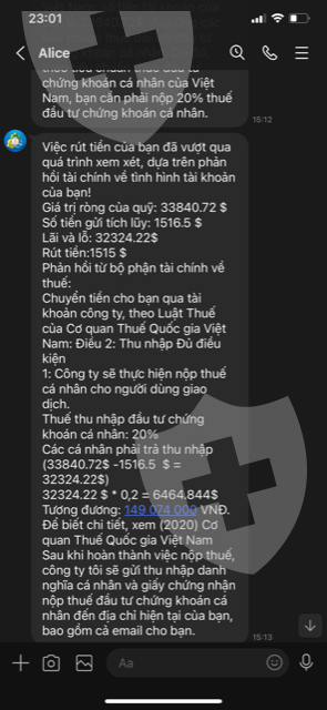 Tôi là nhà đầu tư của Smart Contract Group Limited, tài khoản mt5 của tôi là 131611. Balance: 33.840,72 usd / Deposite : 1.566,5 usd/ Profit: 32.274,22 usd, thuế thu nhập cá nhân 20% : 32.274,22 x 20% =6.464,844 usd =149.074.000 vnd. Sau khi tôi chuyển tiền đóng thuế thu nhập cá nhân đến bộ phận dịch vụ khách hàng theo yêu cầu của họ để họ ủy quyền đóng thuế giúp tôi. Nhưng kể từ khi đó tôi không liên lạc được với họ và tôi cũng không đăng nhập được vào tài khoản mt5 của tôi. Xin hãy giúp tôi rút được tiềnXin cảm ơn