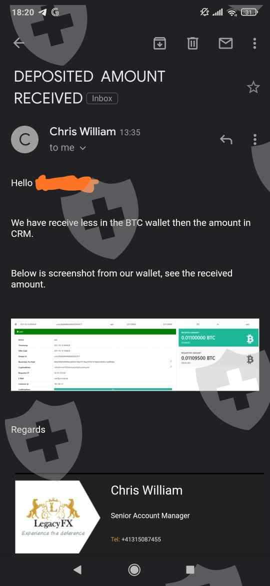 On the 18th of May 2021, I deposited 0.11 bitcoin or 498.96 dollars into my LEGACYFX account. Shortly after I deposited my bitcoin, the price dropped significantly. LEGACYFX then decided to reduce my balance by 86 dollars because they said they didn't receive 500 dollars! LEGACYFX said that they were expecting 0.011095 but only received. 0.11 and that the difference amounts to 86 dollars. Even at it's highest price of $65000/bitcoin, 0.000095 bitcoin only amounts to $6.175. LEGACYFX is a scam!