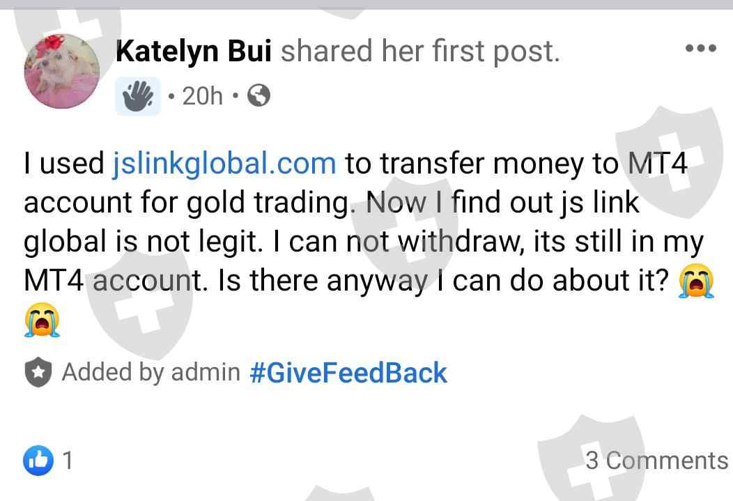 客户无法从JS GLOBAL的MT4帐户中提取其存款。她发现这个交易商是个骗子。其他人请远离这个骗子。