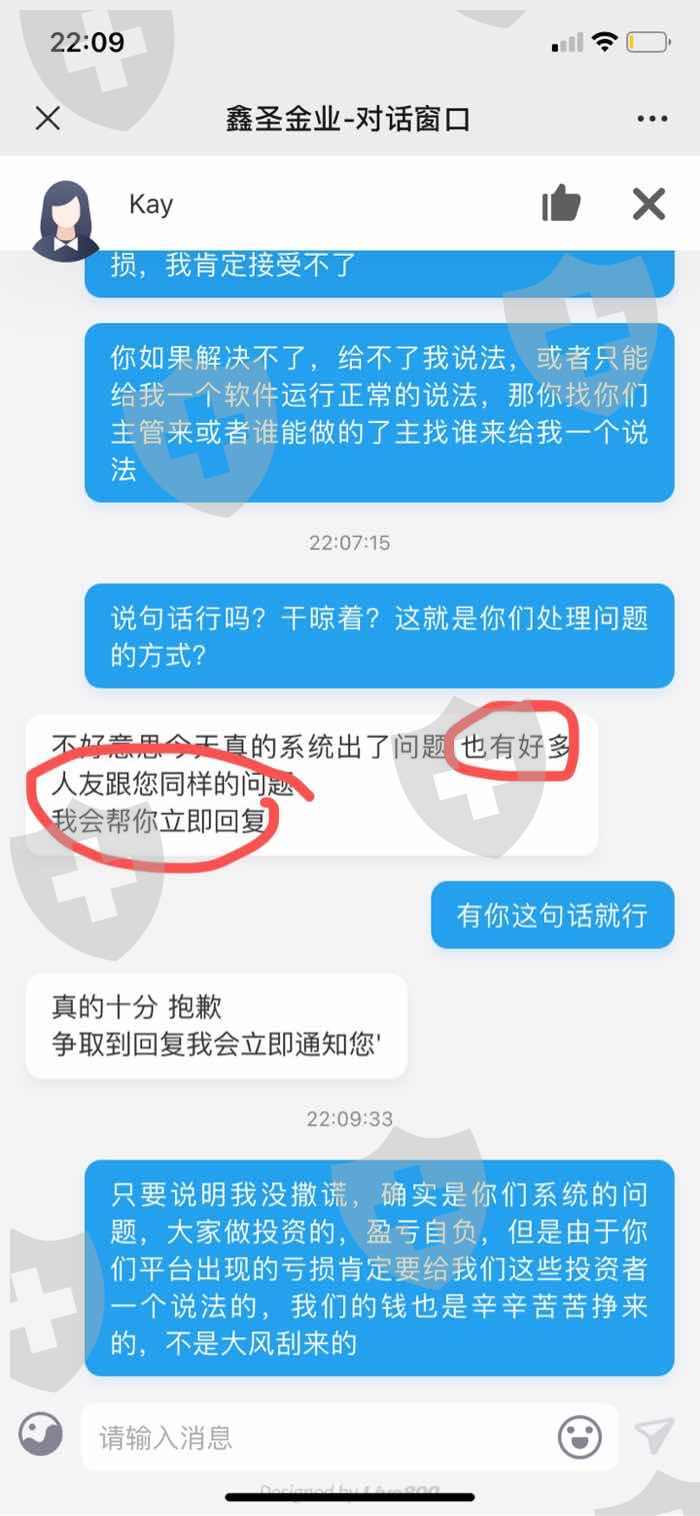 只要一有大行情软件就会很卡,无法平仓,5月1974日晚上9点至9点半,由于软件卡死,直接导致爆仓。爆仓后找客服说软件卡死问题,客服明确表态当天系统确实有问题,有很多人跟我出现同样的问题,并表示会给我一个回复,结果第二天客户经理直接推的一干二净说客服以为我说的是早上无法登陆的事情。也就是可以理解为,软件卡顿、卡死=无法登陆?等技术部门调查了一天,说当晚mt4运作正常,但是我询问mt4运作正常是否能保证鑫圣软件一定正常运作,客户经理一直逃避问题,不做正面回复或直接几个小时不回复拖时间。