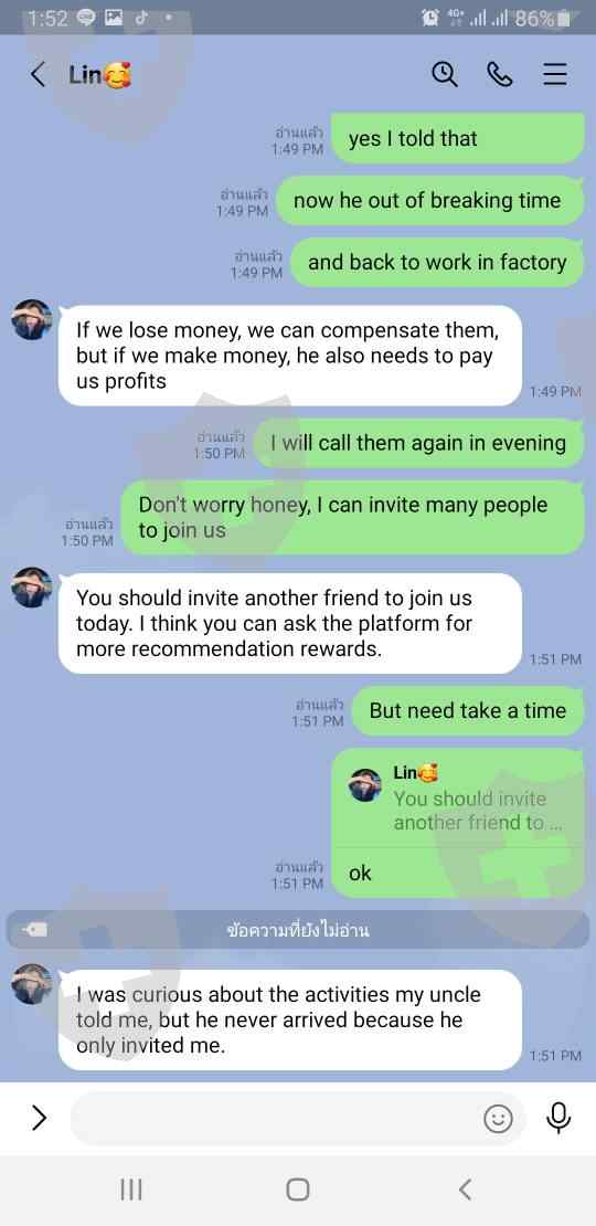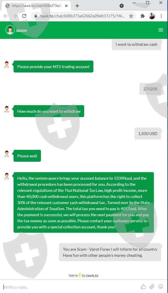มีผู้หญิงทักแชตมาและอ้างว่าเป็นนักธุรกิจหญิงอยู่ในเมืองไทย คุยแชตกันประมาณ 3 วันบอกว่ามีวิธีหาเงินจาก MT4 กับ Mwng ซึ่งสามารถทำกำไรได้ทุกครั้ง และฉันสามารถถอนเงินได้ภายใน 2 ชั่วโมง ประมาณ 2 ครั้ง เขาอ้างว่าลุงของเขาเป็น ผจก.ธนาคารที่อเมริกา รู้ข้อมูลภายในมากมาย วันต่อมาบอกให้ฉันเปลี่ยนไปใช้ MT5 และโอนยอดจาก Mwng ทั้งหมดไปที่ Varot Forex ซึ่งหลังจากนั่นฉันไม่สามารถถอนเงินได้ ฉันขอถอนเงินต้นออกประมาณ 8,100USD แต่พวกเขาบอกให้ฉันชำระภาษี จำนวน 4,017USD