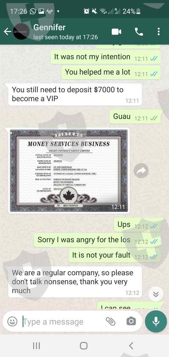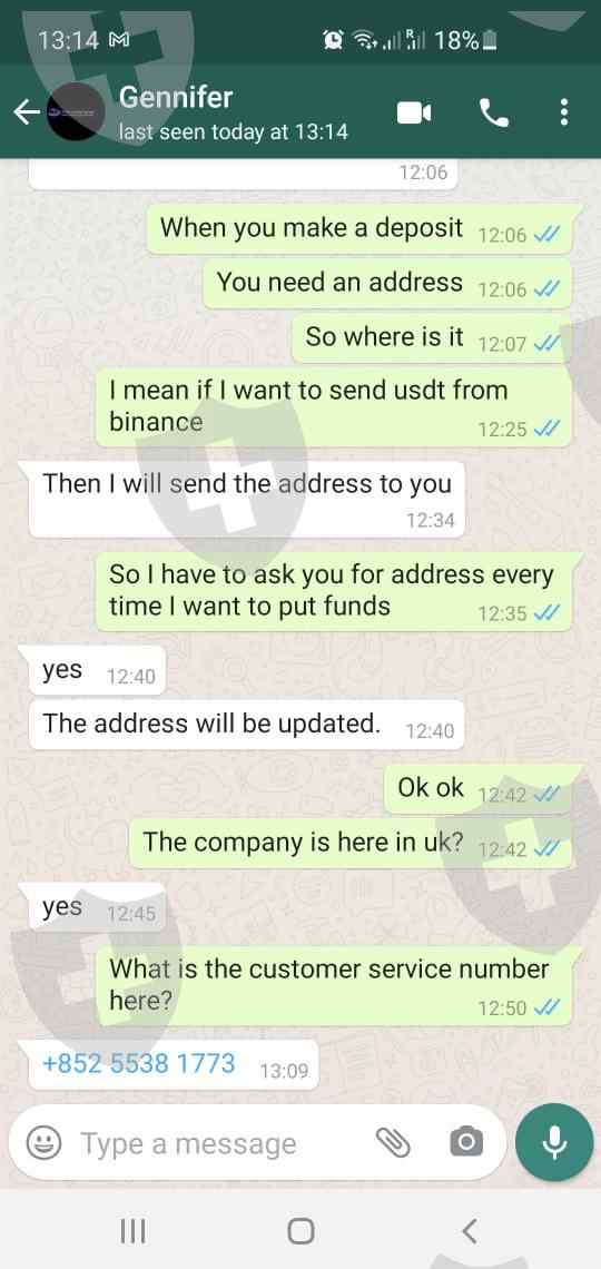 我询问了位于英国的公司地址。该公司仅在这里向一位雇主(即首席执行官)注册。如果试图找到它,它就没有物理位置。英国没有客户编号,这很奇怪,唯一的电话是香港的。如果您尝试在mt5中存钱,则没有存款地址,助理会给您该地址。骗局100%