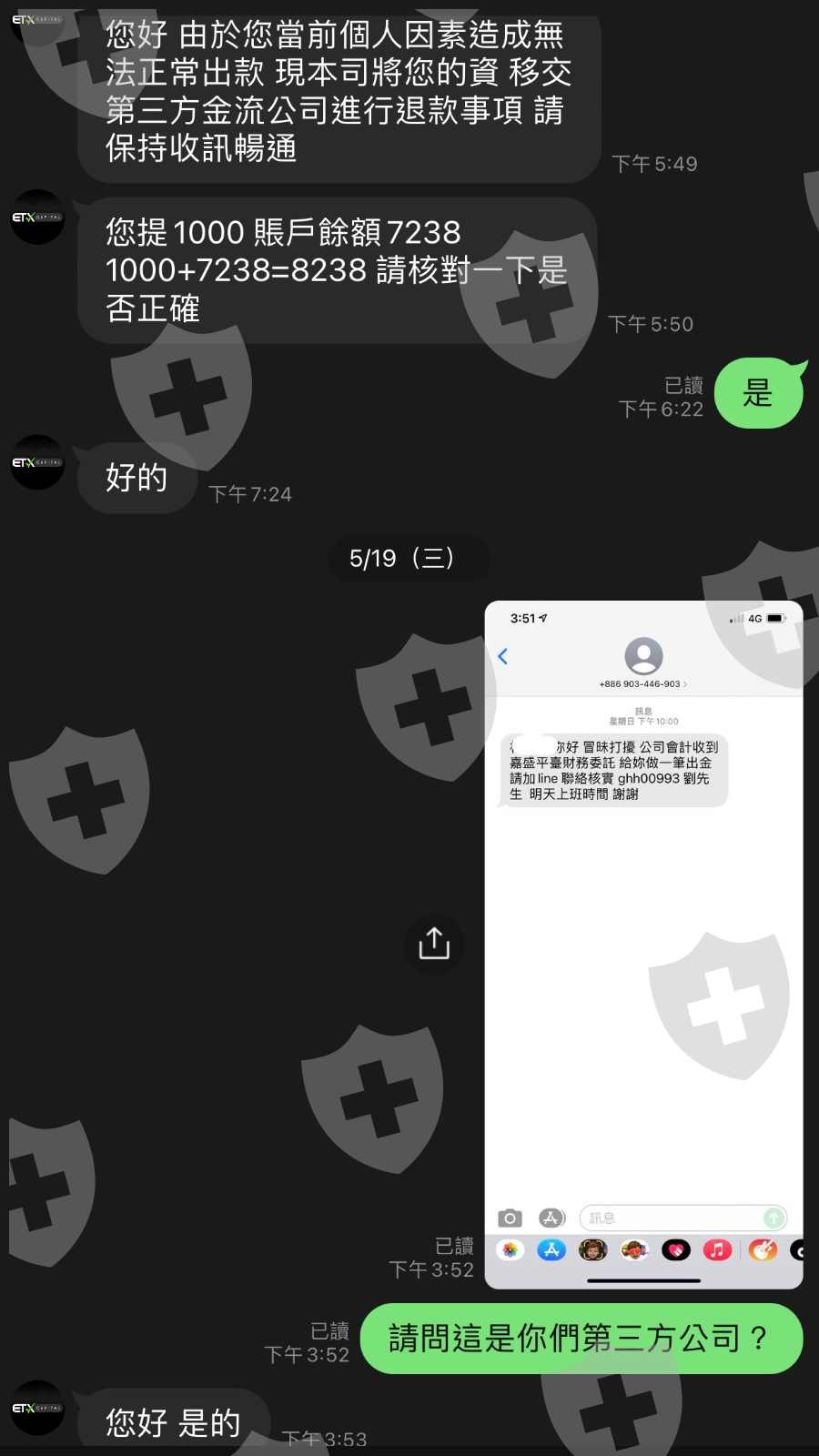 無法出金帳戶錯誤解鎖要5000美 沒有解鎖將無法使用 鎖後幾天ET客服說 將交給第三方金流公司進行退款 隔天手機簡訊傳來 自稱 嘉盛平台財物委託給我做出金加line聯絡核時實。說 因為銀行控管方面嚴格要你付5萬元台幣的保證金確保沒有問題後會計會去銀行辦理約定之後進行審核 過幾天 說 公司審核沒有通過必須當事人跟平台各繳10萬元的出款風險金…