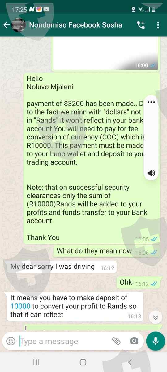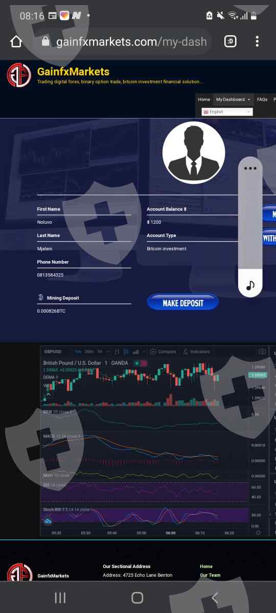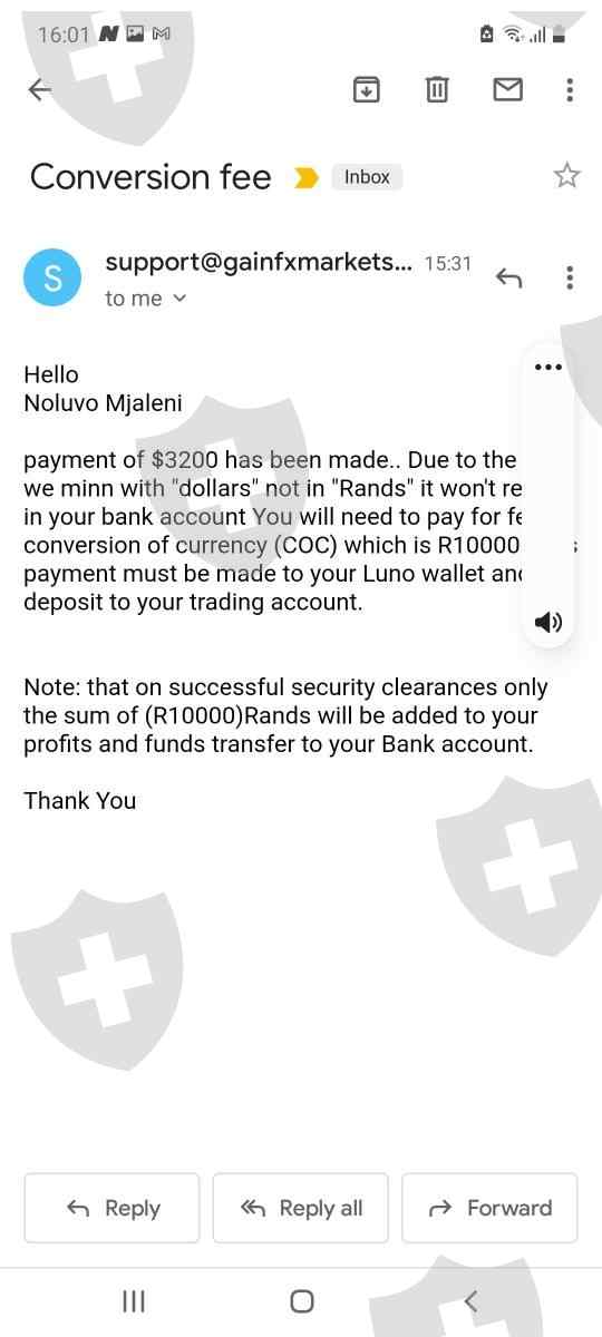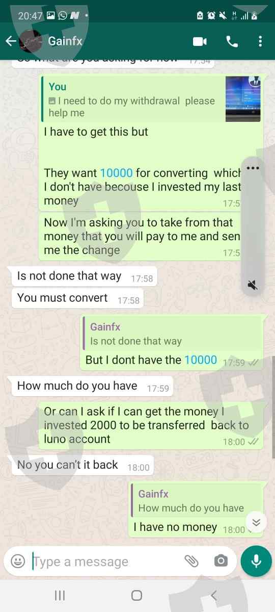 我在 luno 存入了 R2100 并转入GainfxMarkets.com 是 1200 美元,但在提款日 3200 美元我无法提取我的利润,他们说我必须支付更多的钱 R10000 才能获得我的利润。