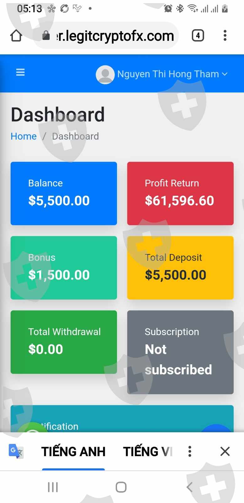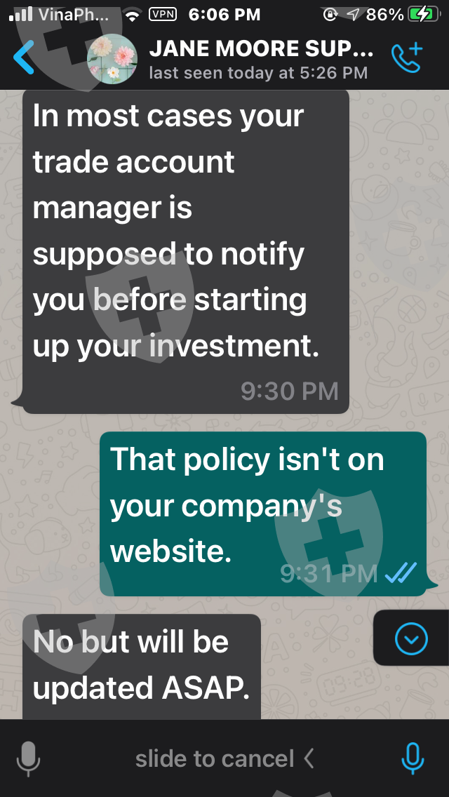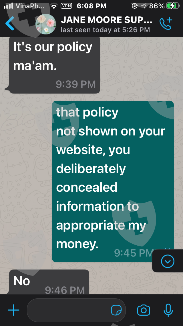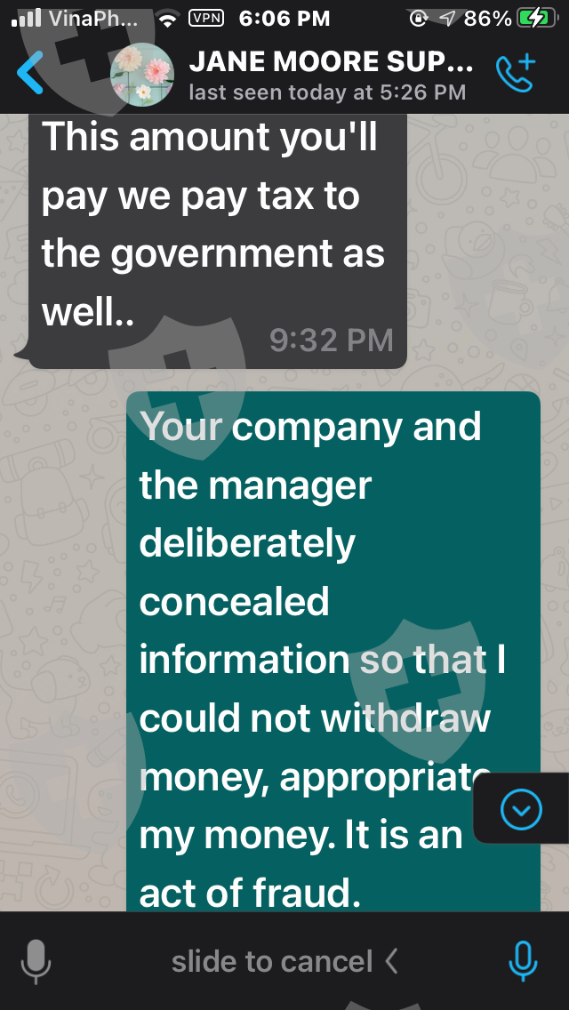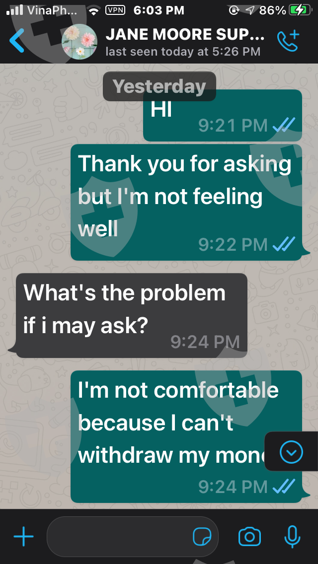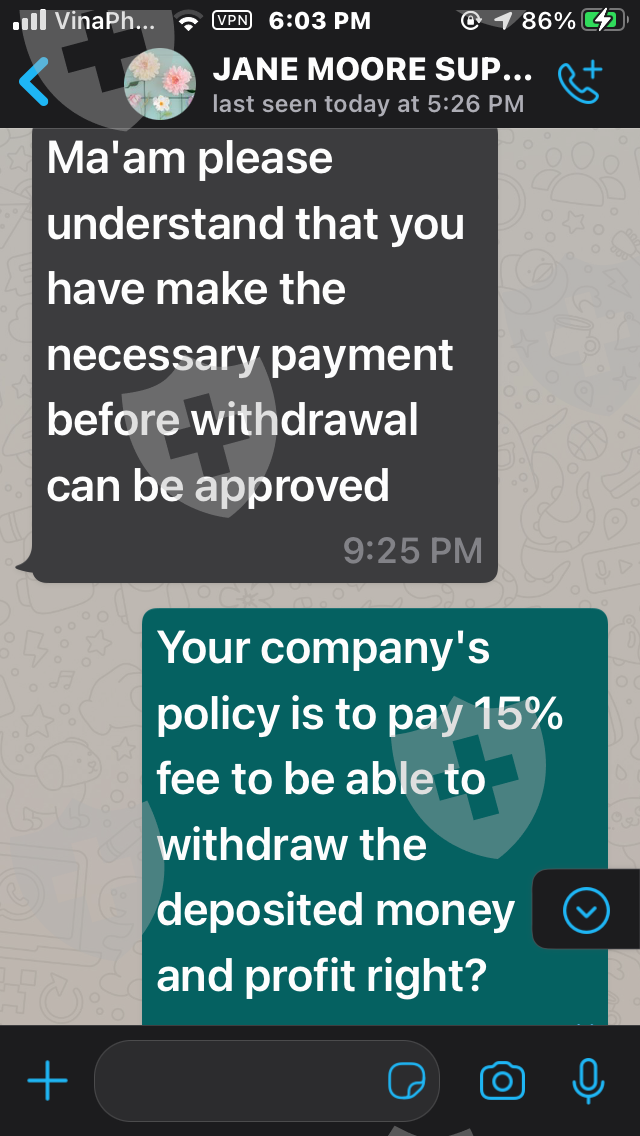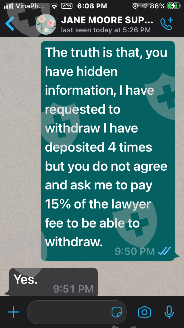 嗨,我叫Tham。我来自越南。我与经纪人签约 https://Legitcryptofx .com/ 并存入我的帐户 5,500 美元。我已经多次要求提款但没有被批准。请帮帮我,我只需要提款,非常感谢,祝您有美好的一天。