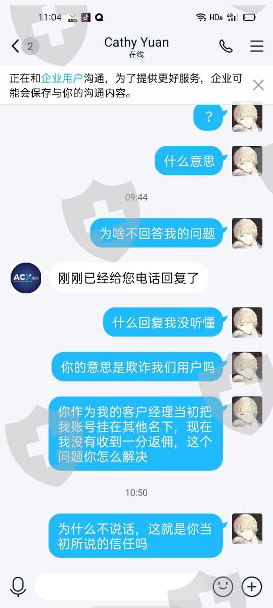 当初我在官网留言说要开户,随后有个人自称是客户经理,说帮我提交工单挂在其他代理下面会有返佣,我陆陆续续入了1万多美金交易很多手,没有收到一分返佣,我就找客户经理追讨我的佣金,刚开始的时候回答极度敷衍我,现在客户经理直接不回我信息,在官网投诉多次未果