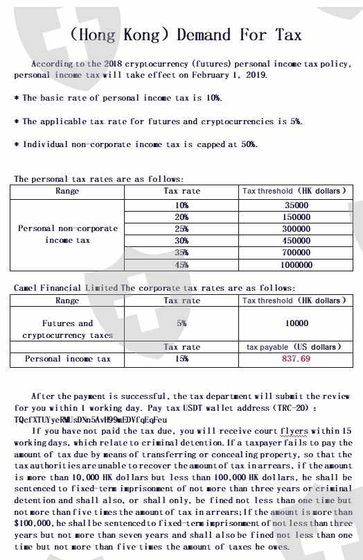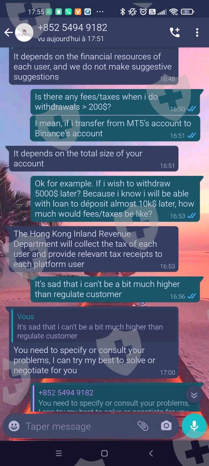 你好。我很遗憾地证实了CamelFinancial经纪人的欺诈怀疑。我在 Tiktok 应用程序上被“钓鱼”了,一个叫杨璐的人,在一位在金融界工作多年但从未做过的“叔叔”的支持下,她设法说服我跟随她在 Metatrade 5 上交易任何错误。我让自己动心了,选择了她向我推荐的 CamelFinancial 经纪人,没有担心。我存入了大约 200 美元,然后我能够很快收回我的费用。她提出将 500 美元直接汇入我的 MT5 账户,以便提高到 2000 美元左右。昨天,她想起必须纳税,这让她付出了代价......我要求向经纪人提款,这是不可能的,因为对他们来说,每周只能提款一次......我上次每周提款 200 美元, 我今天不得不等,他们给我发了一份没有标志的文件,没有任何东西,基本上是说“在 6 月 15 日之前你必须支付 800 和一些美元,否则你的帐户将被冻结......”那个女人甚至生气了当她告诉我把她的美元还给她时,这是我不能做的事情,因为钱在我的 MT5 账户中......当然,她还谈到在社交网络和国际刑警组织上提起此案也是为了恐吓我。 ..附上一些截图,里面有经纪人和抖音老婆的相似之处,还有著名的要交的税....
