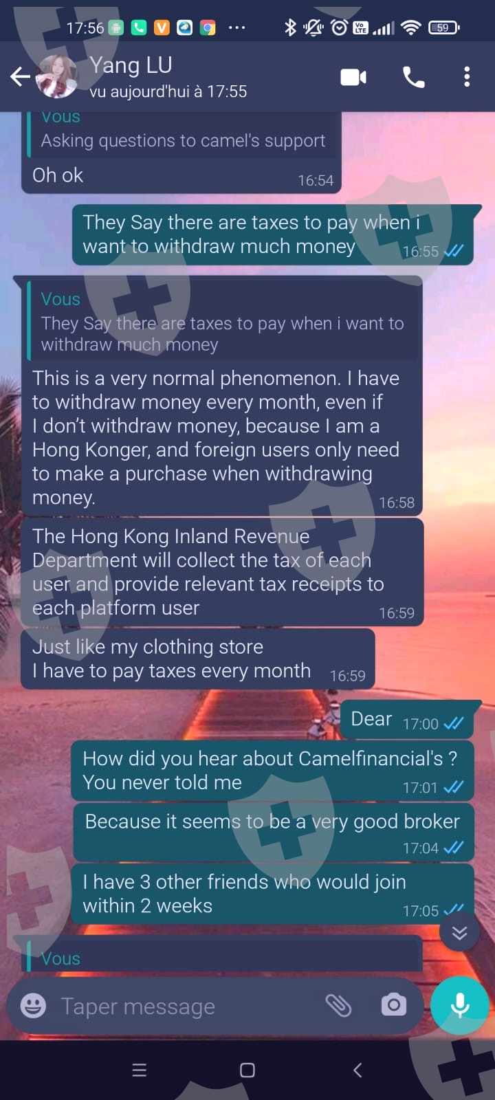Bonjour. Je confirme malheureusement les doutes frauduleux du broker CamelFinancial. Je me suis fait "hameçonner" sur l'application Tiktok, par une personne prénommée Yang LU, qui a réussi à me convaincre de la suivre dans le trading sur Metatrade 5 grâce à l'appui d'un "oncle" qui travaille dans la finance depuis de nombreuses années et qui n'a jamais fait d'erreurs. Je me suis laissé tenté et ai sélectionné ce broker CamelFinancial qu'elle me recommandait sans souci. J'ai déposé environ 200$ puis j'ai pu rentrer dans mes frais rapidement. Elle m'a proposé de m'envoyer 500$ directement sur mon compte MT5 afin de monter jusquà environ 2000$. Hier, elle évoque devoir payer des taxes, que cela lui coûte cher... Je demande à effectuer un retrait au broker, impossible car pour eux, c'est un seul retrait par semaine... J'avais retiré 200$ la semaine dernière, j'ai du attendre aujourd'hui et là on m'envoie un document sans logo sans rien en me disant en gros "voilà, tu dois payer les 800 et quelques $ jusqu'au 15 Juin sinon ton compte sera bloqué...."La femme s'emporte même en me disant de lui rendre ses $, chose que je ne peux faire vu que l'argent est sur mon compte MT5... Et bien sûr, elle parle d'évoquer l'affaire sur les réseaux sociaux et Interpol également afin de m'intimider...Ci-joint quelques screenshots avec similitudes entre broker et la femme de titktok et la fameuse taxe à payer....