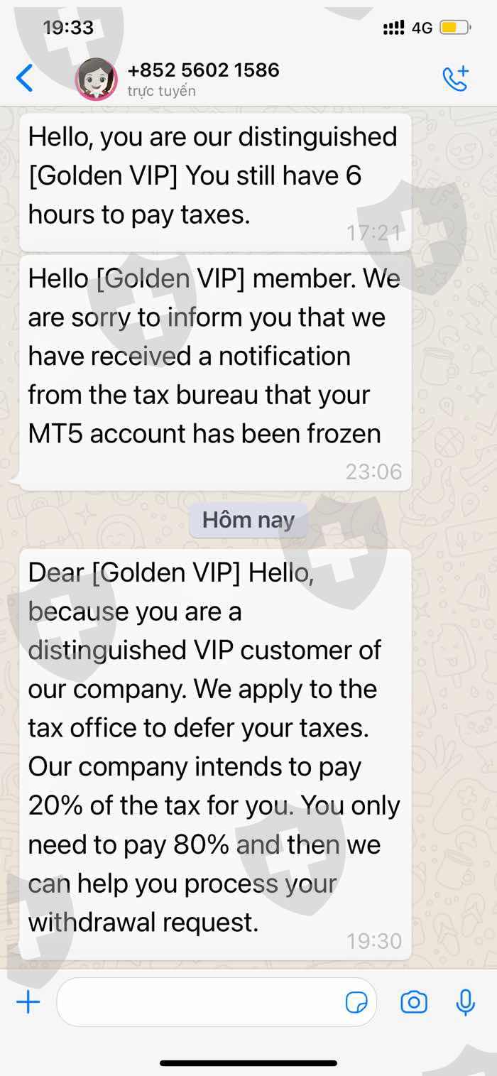 Tôi đã mất một khoản tiền lớn vào đây.Đến khi tôi nghi ngờ và xác minh sàn giao dich này là lừa đảo tôi mới ngỡ ngàng và khi đó đã quá muộn.Tôi cố gắng rút tiền nhưng không được.Họ bắt tôi đóng 20% thuế trên tổng tài khoản mà không được khấu trừ từ tài khoản Mt5. Mong đây sẽ là lời cảnh tỉnh chia sẻ cả nhà cùng biết. Nên tránh xa những nhà môi giới ko uy tín.