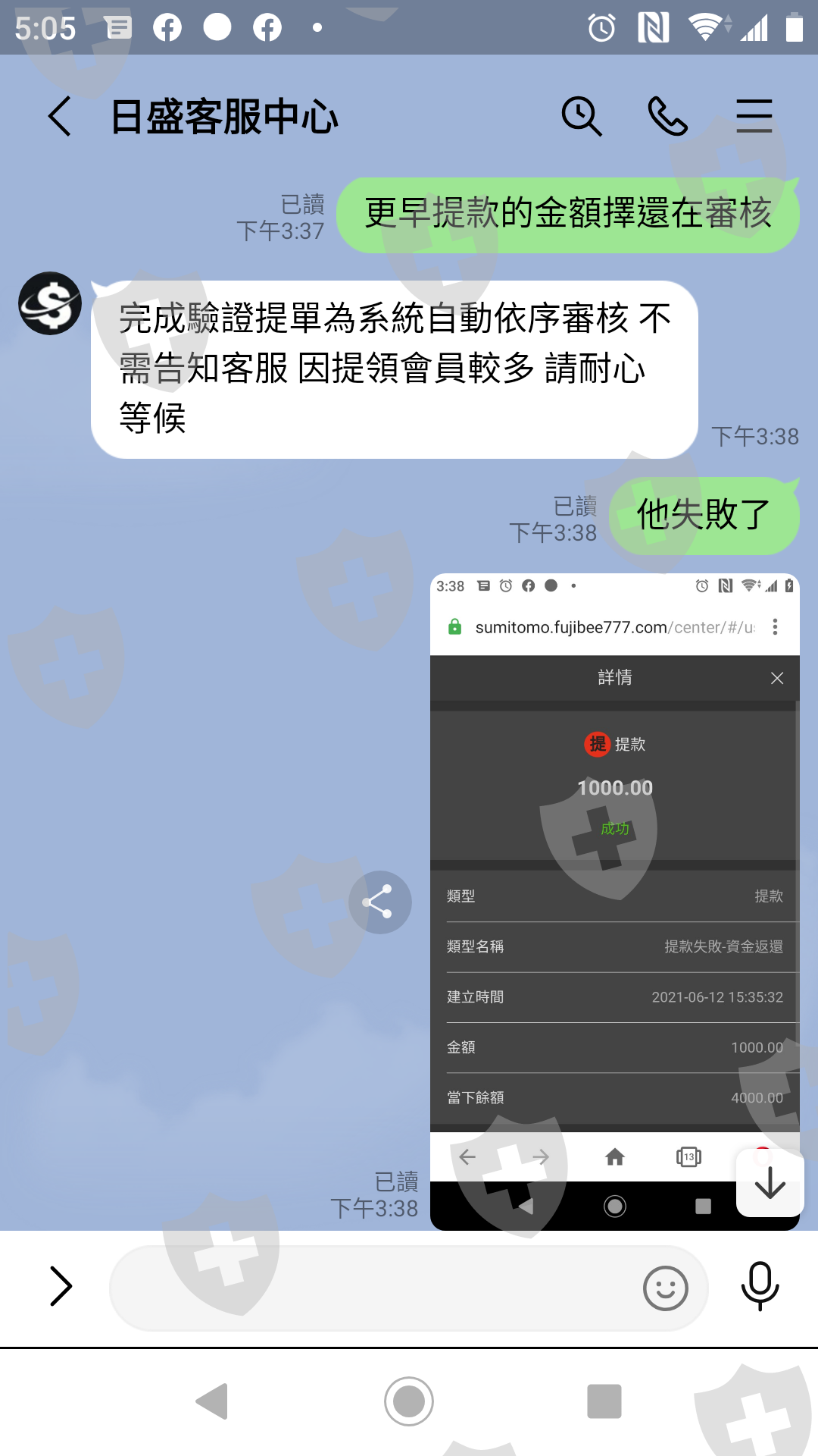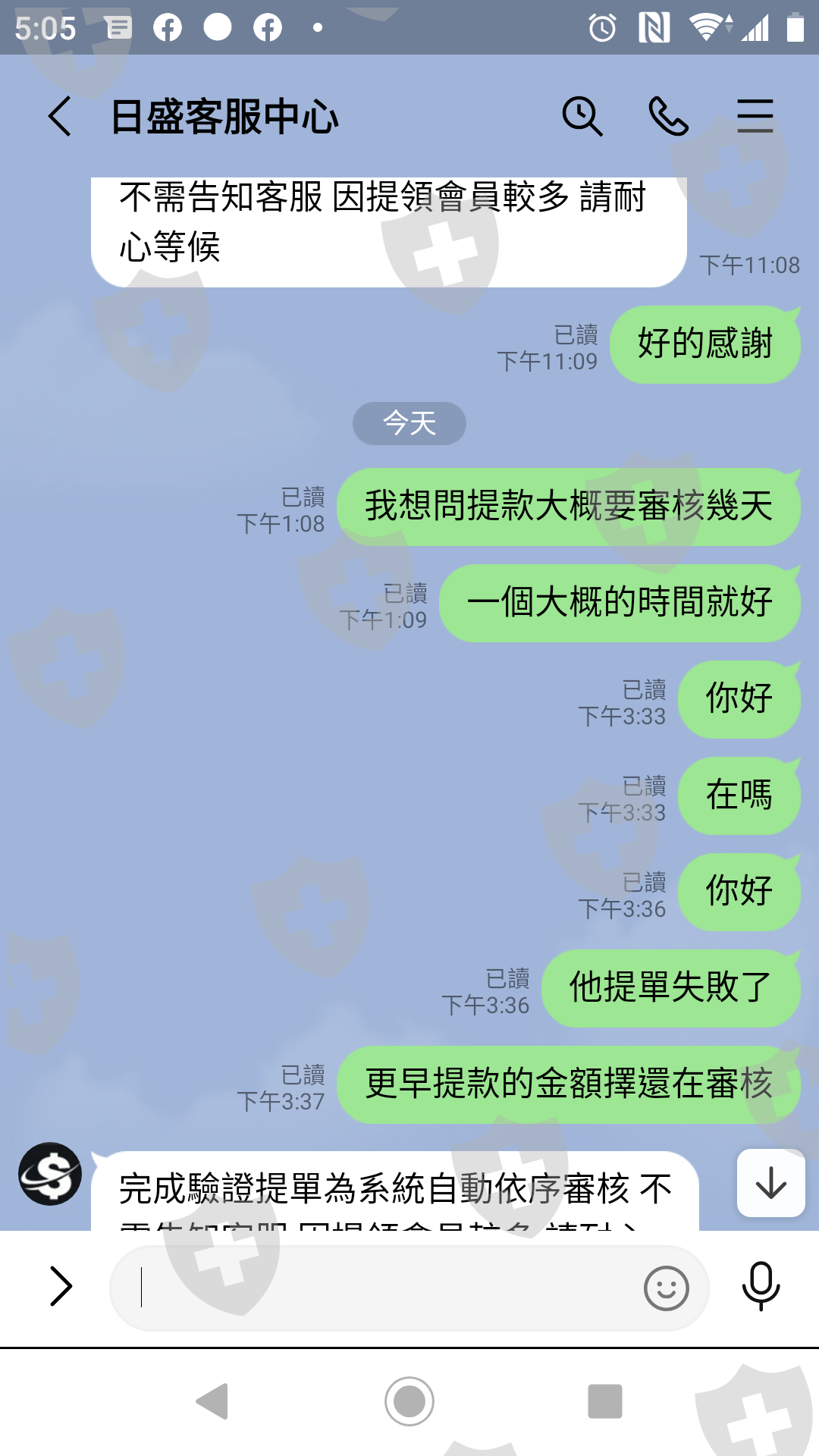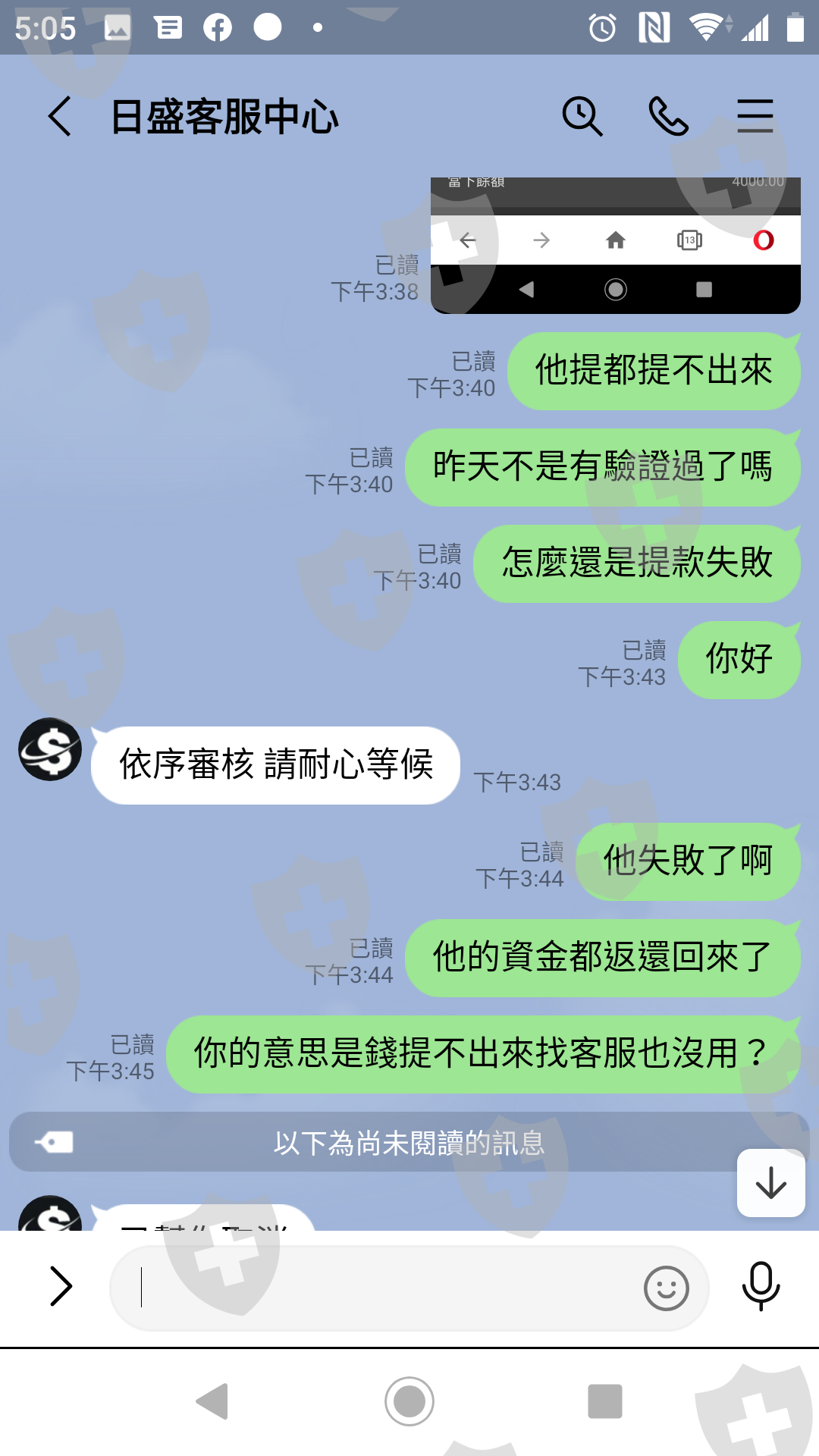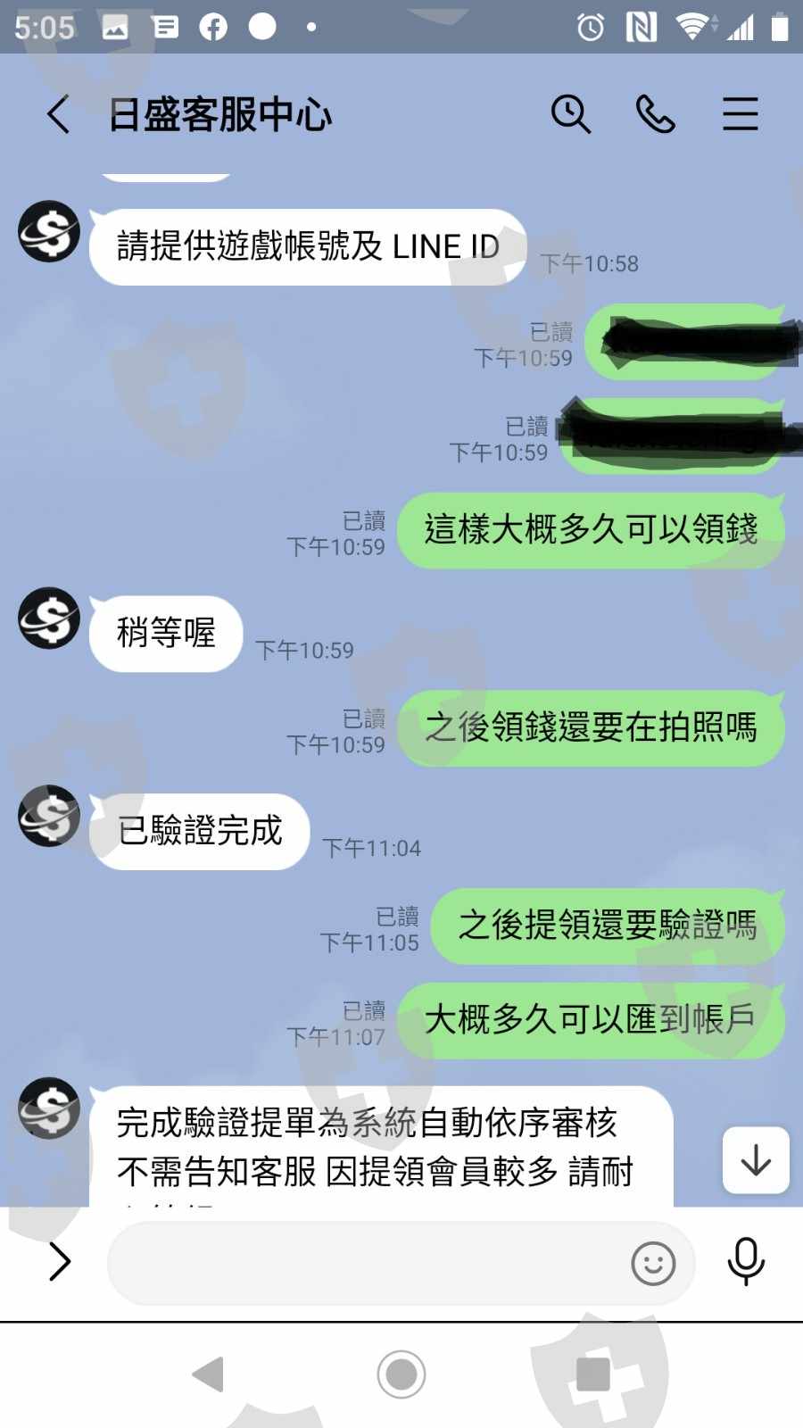 一直說太多人提款要等,等了3天每天半夜中午早上下午都提款一次審核五六個小時提款失敗客服一直說要等待然後去查網路才知道詐騙。希望不要在有人被日盛娛樂城騙時間又騙錢了。