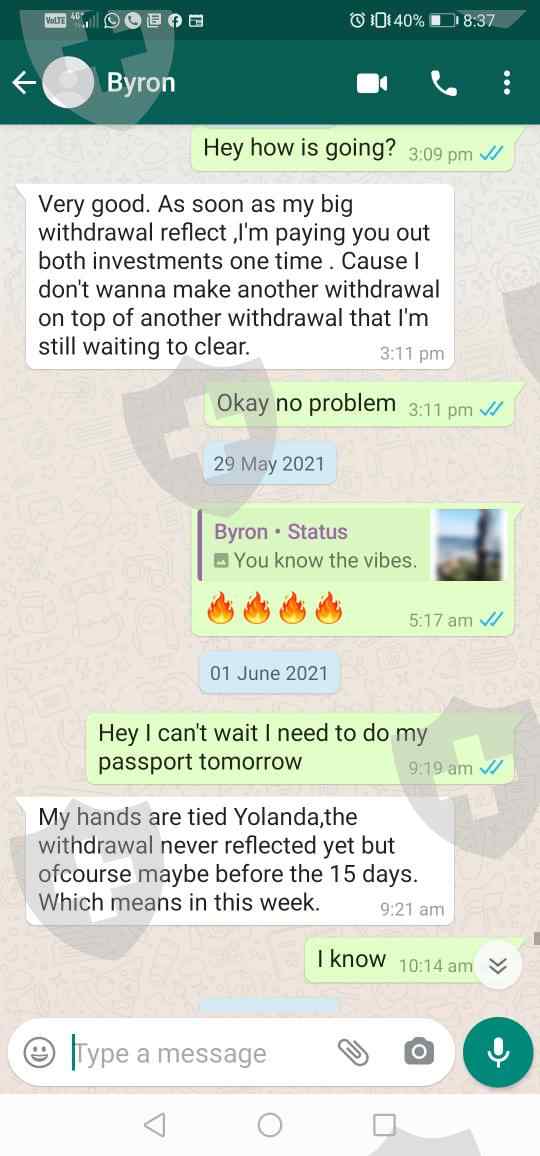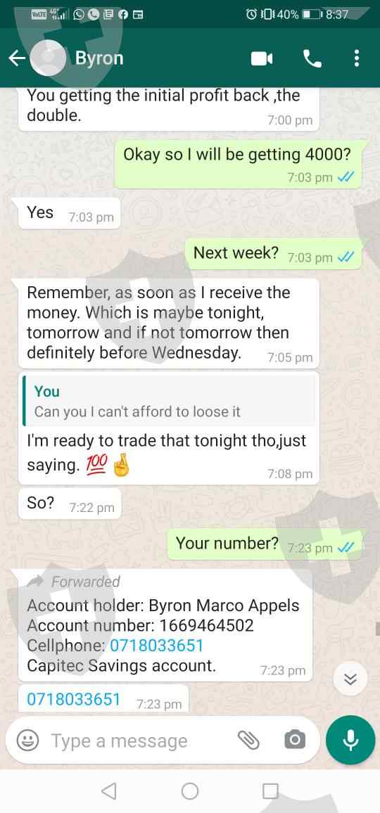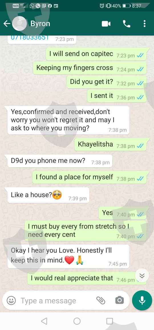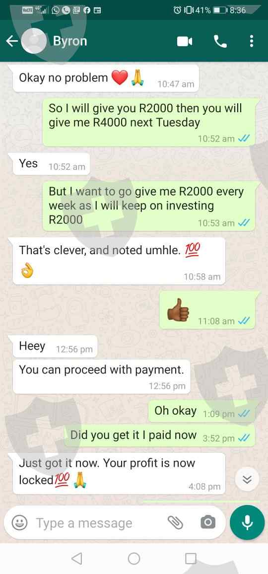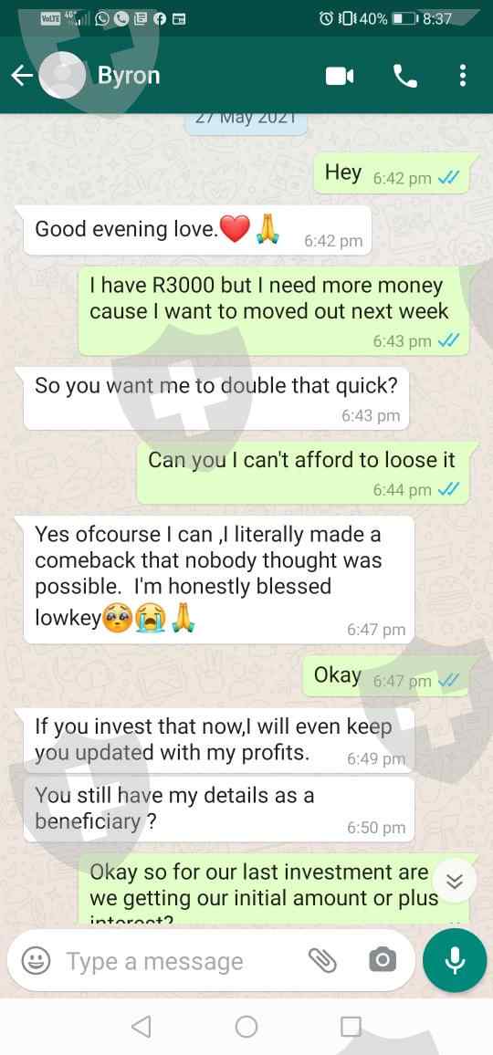我被一个叫拜伦的家伙骗了 R5000 我先寄了 R2000 然后是 R3000