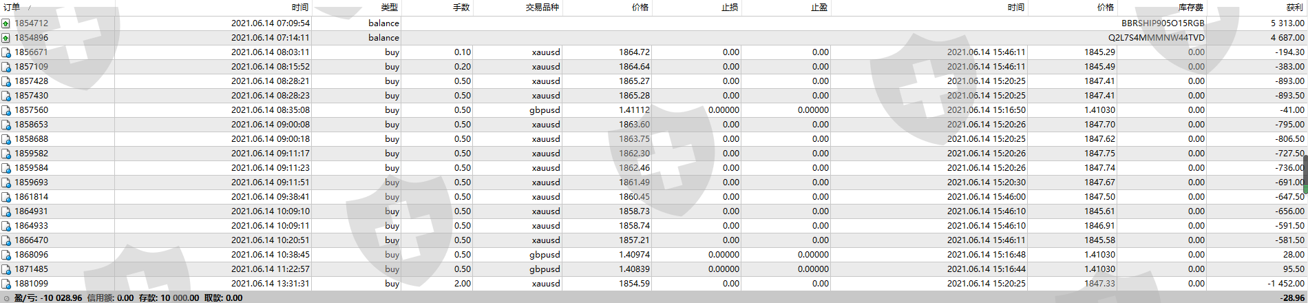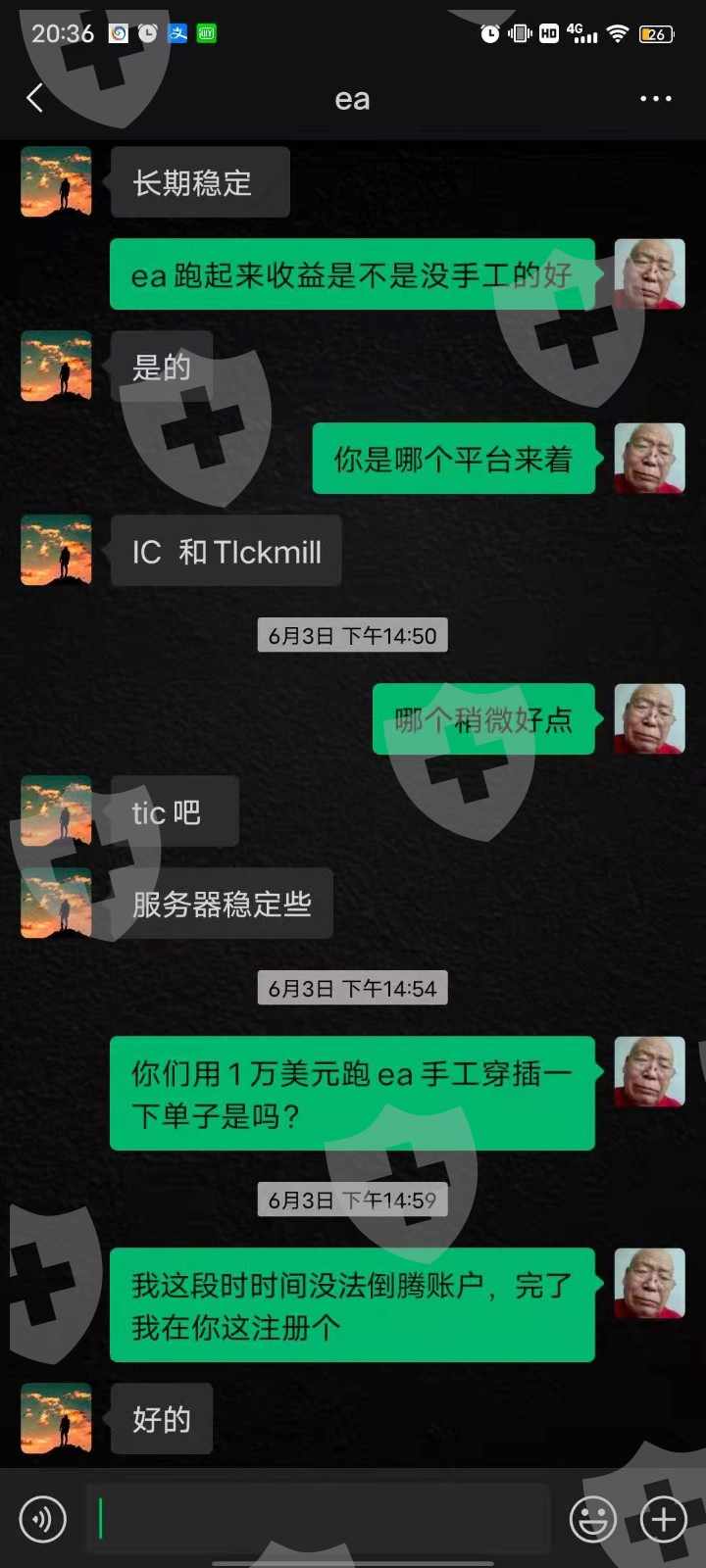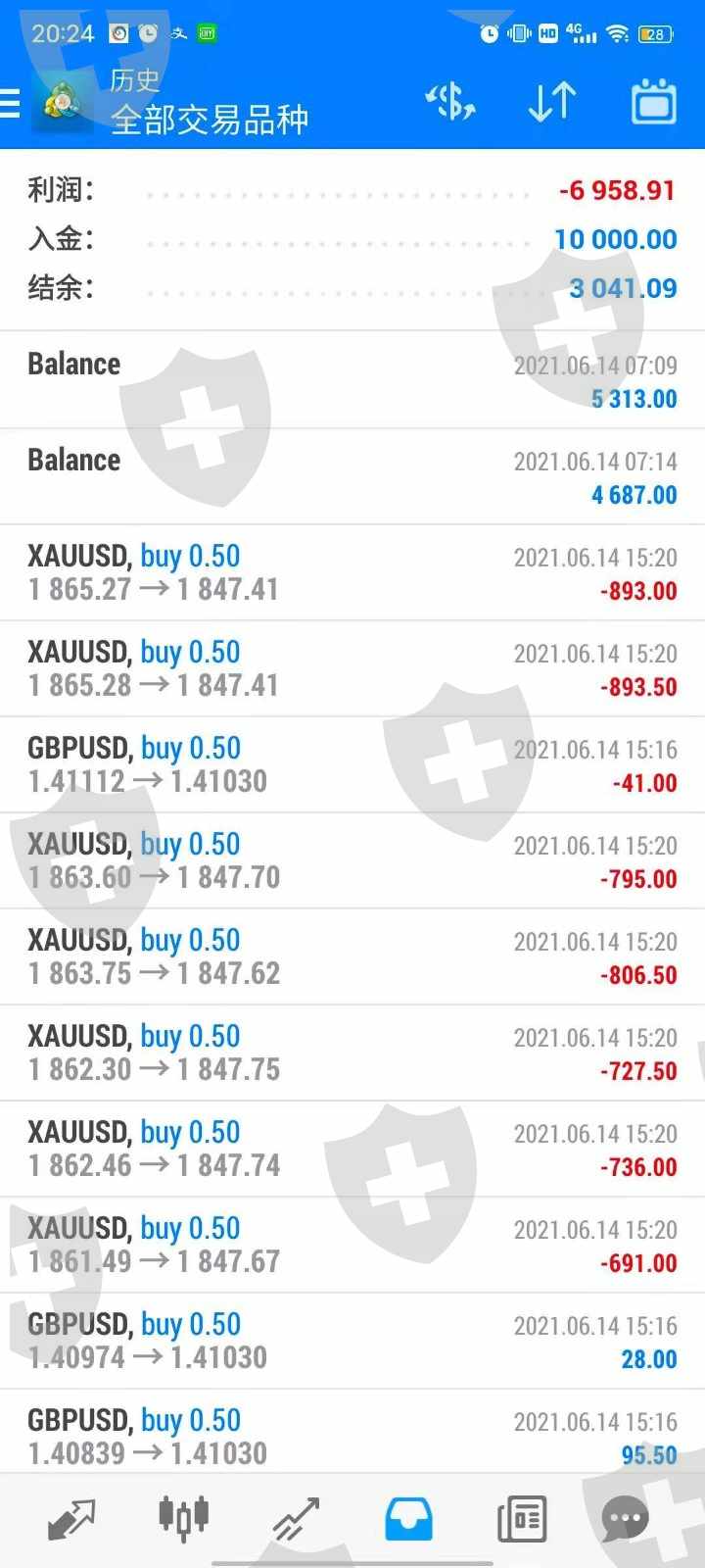Tickmill平台代理IB91312043承诺资管半天时间将我本金部赔光,5月21日 开始我本人询问买开始ea,后来我说没时间他这边可以帮忙代挂,中间插入手工单子,承诺风控15%内 帮忙资管,每个月收利润的三成 6月14日我在Tickmill平台中午入金1万下午,这个代理不管资金量,重仓逆势操作不加止损,下午本人爆仓,损失1万美金,本人账户号10214191 观摩密码Aa123456+ 服务器Tickmill-Live10