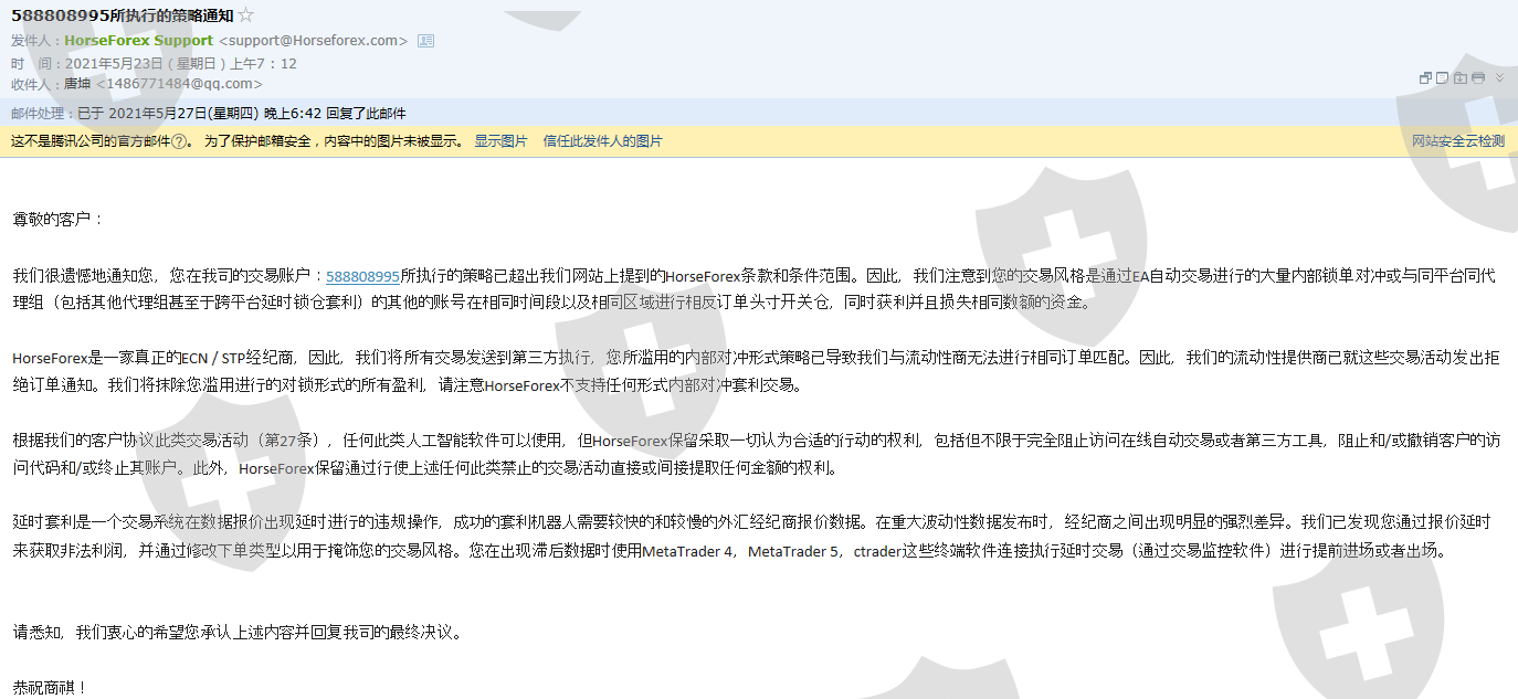 本人于2019年马汇刚刚走澳汇分开出来的时候就在这个平台注册,期间到2021年5月接近两年的时间一直亏损,期间不断入金一直亏。总共入金大约13000多美金,5.19号的时候因为抓住比特币以及以太坊空头,把之前亏的本赚了回来。然后我就在5.20号的时候在后台申请出金,5.21号的时候马汇平台发邮件说出金请求已通过审核。期间一直没到帐,5.23号的时候马汇给我发邮件说我违规操作,用什么套利机器人,通过报价延迟来获利。直接把我MT4账户封了,后台也禁止我登录。联系马汇让他们拿出我交易的单子,提供我违规的证据,马汇也没有任何回应。我要是会用这些,我难道会亏两年再用?马汇难道就是只能亏,不能赚,赚了就是违规操作?亏了就是正确操作?而且我出的还是本来就是属于我自己的本金,这难道都不行?从5.23号至今,我每天联系马汇,联系客服,没有任何回应,客户经理也不回话。马汇,还我本金,还我血汗钱。