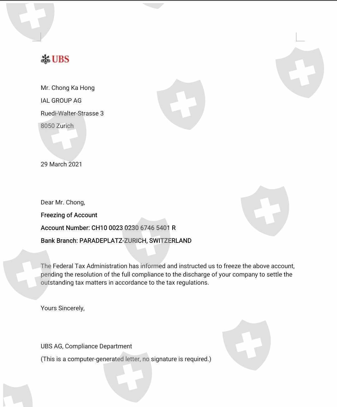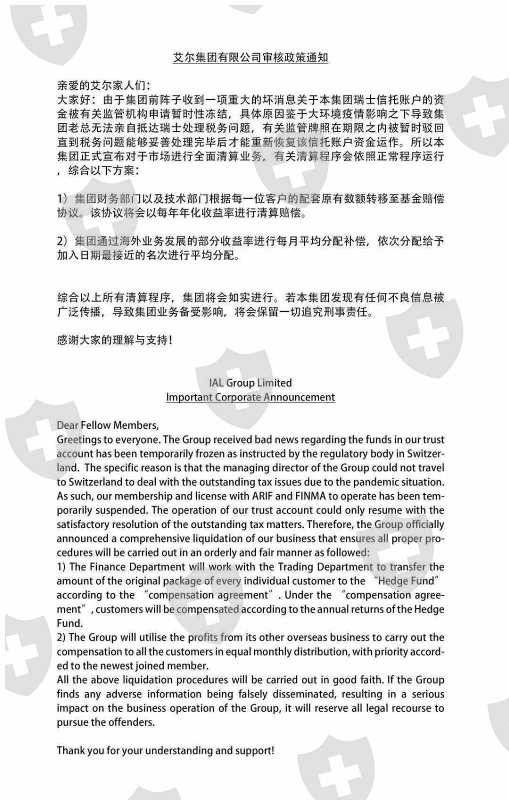 3月开始不能出金,4月就宣布公司退出马来西亚市场,清算?然后给一张UBS信说瑞士的资金被冻结了! 那两夫妻wins和silvy说公司会每个月退钱,我等了几个月还是一分钱都没有拿到!