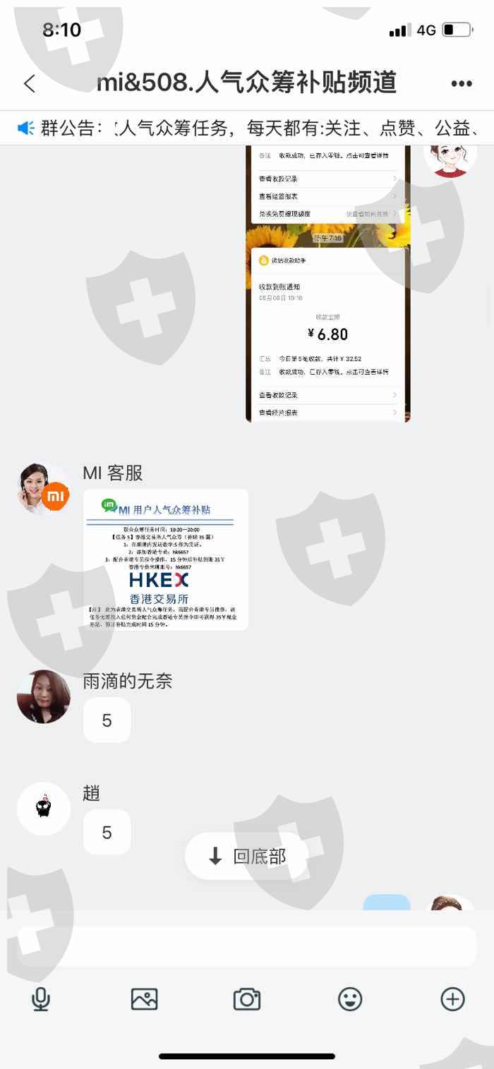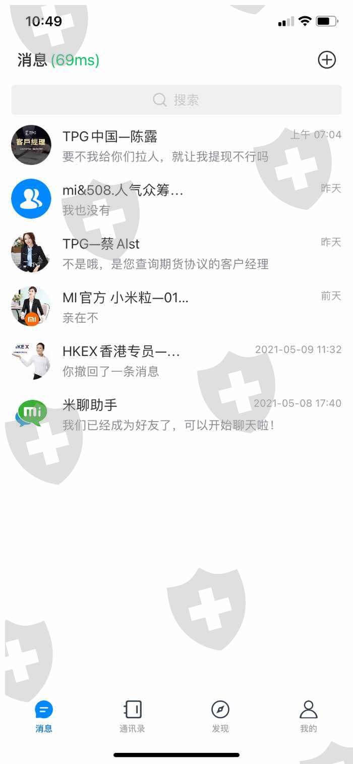 5月11日下午我们在 “米聊APP” 上面一个群叫做“ 人气众筹补贴频道”,这个群里诱骗引导每天都会叫我们做任务领取福利,在5月11日的下午他们在群里发送了一个任务;让我们加一个好友账号是 “mi0112" 这个人的昵称叫做 ”官方客服小米粒“ 加完之后让我们在这个软件上找到 ”HKEX香港交易结算所“ 帮他用手机号注册一下,邀请码是7418.,注册完我qq邮箱里收到我注册了盈利智投APP然后按照他的指示买小米集团的期货,每一场的购买分为三期,我注册完账号按照他的指令去操作,然后账号显示了进账38元,可以正常提现,之后群里又开始发送了第二个任务,让我们期货认购,从100元---5000元不等,我向导师认购了200元,导师让我去咨询客服,于是客服TPG中国-陈露没有让我对公充值。而是给了我一个卡号,并且说明不支持支付宝和微信只能手机银行转账