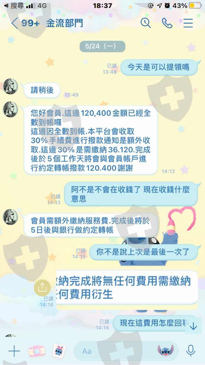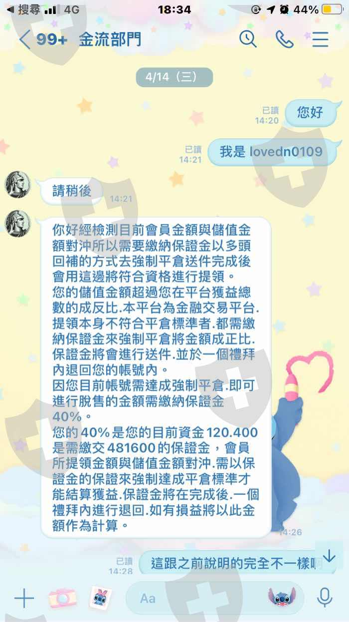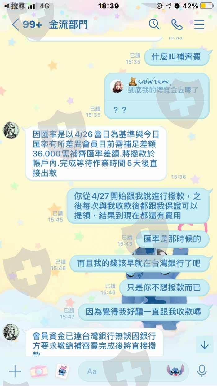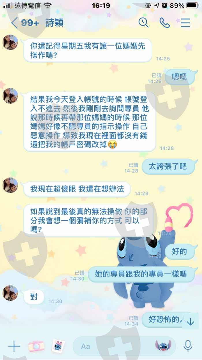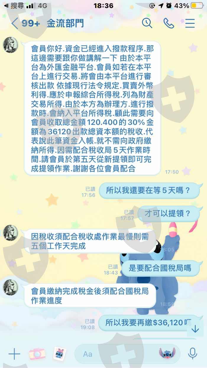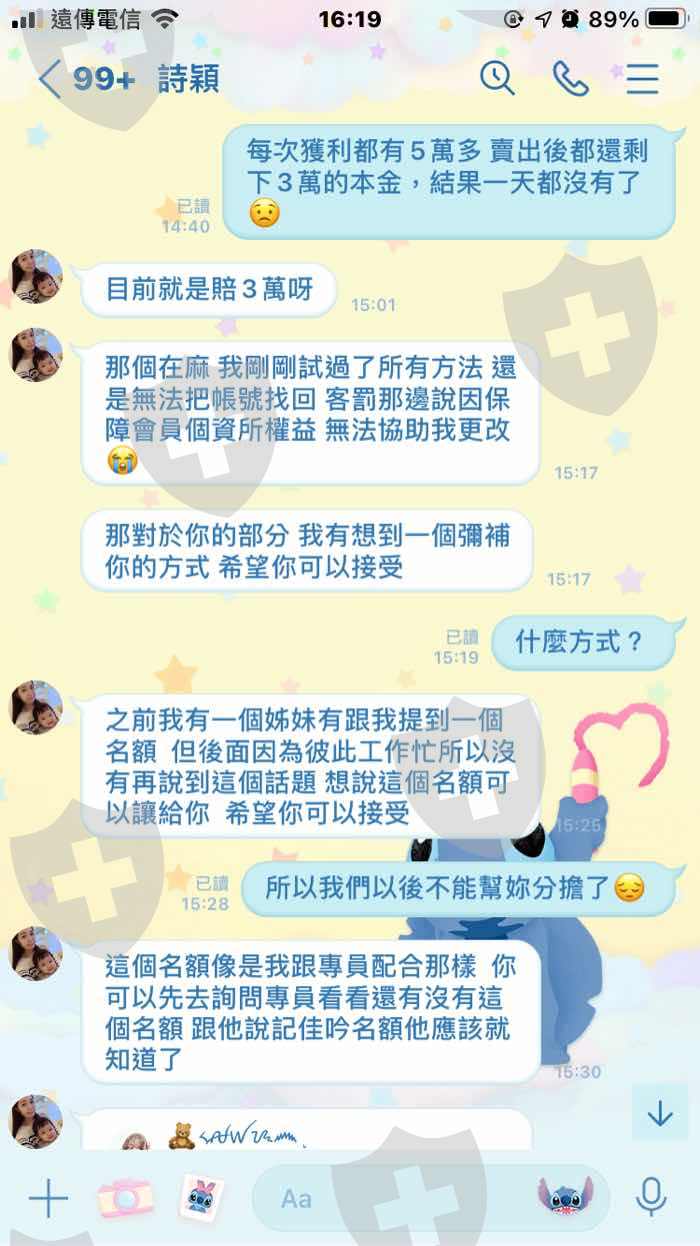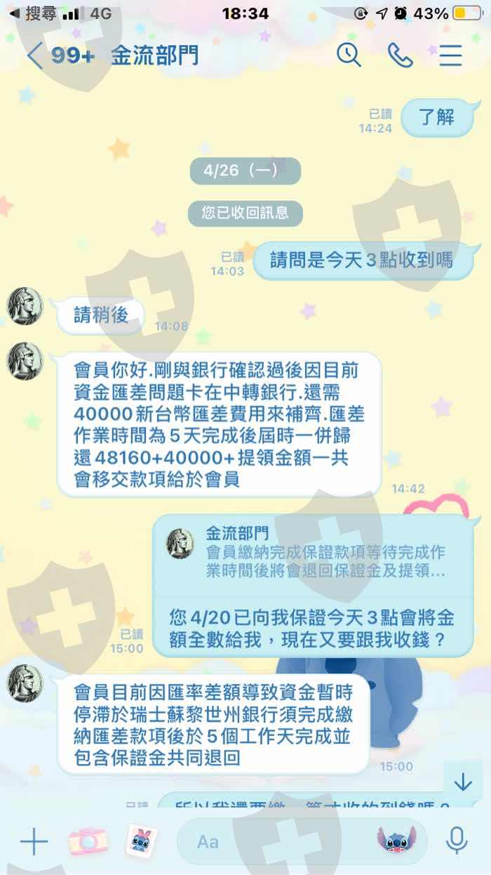 一開始是跟雇主(詩穎)聯繫的,後來結交了一位專員(Eoch) 開始幫雇主工作,後來因為雇主說帳號被另一位兼職人員更改密碼所以提供給我另一個名額讓我在裡面自己投資獲利,結果客服卻跟我說:我的帳號打錯了,要求我要提高三倍的獲利才可以做領取,後來又幫我把案件交給金流部門開始一連串的收錢。第一次跟我收取高額的保證金他說會退還,結果五天後又跟我收了第二次的費用,第二次他跟我收了匯差,第三次跟我收取蘇黎世州銀行的解款手續費,第四次跟我收取蘇黎世州銀行的開通費,第五次跟我收取國稅局的稅金費,第六次跟我收取郵費電通費,第七次跟我收取匯差補齊費,總共七筆費用他每一次說每一次的收款五天後都會退錢,而且都說可以一次做提領,但是都是收錢,不出金,最後一次要出金的時候,金流部門跟我說請稍後,一句請稍後我等了四五天,後來我才發現他換了一個網頁,而我的帳號登進去我才知道我的帳戶被凍結了。