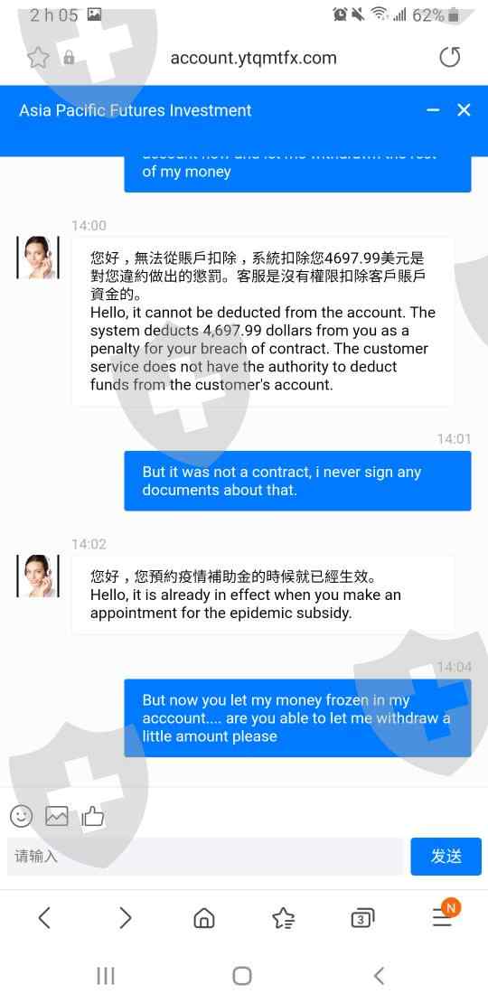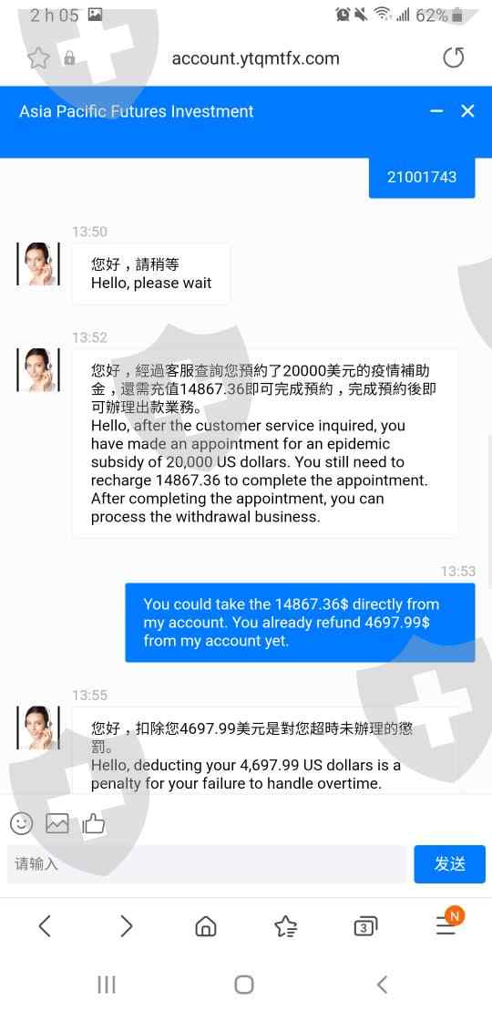 创建帐户后,我可以提取 2 次现金。随后,他们提供了与 Covid-19 相关的礼物。我的账户存入了2888美元的USDT,之后就无法提现了。客服要求我充值 $14867.36 USDT 否则我的钱会被冻结。请不要在本网站上注册帐户,您肯定会遇到问题。