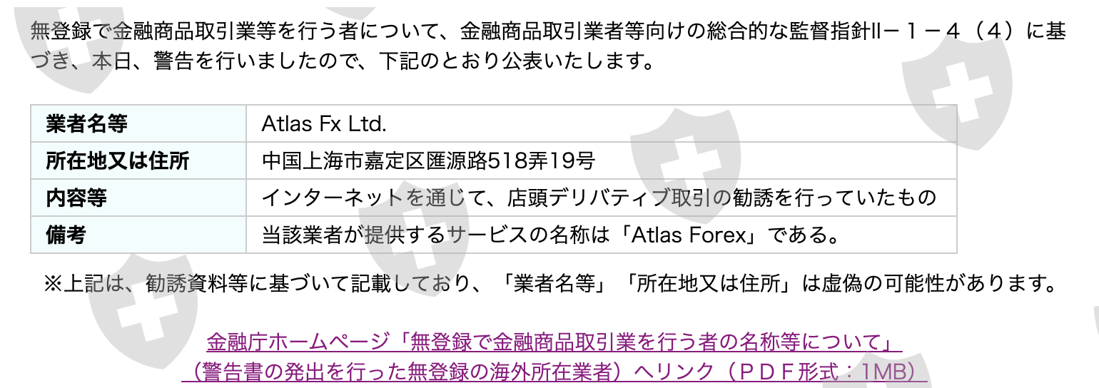 关于未经注册从事金融工具业务的人(Atlas Fx Ltd.)