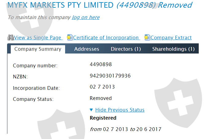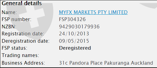 拡散してほしい「Contact Us」の項目にある連絡先情報は以下のようになっています。 Add: 1a Wakeling Avenue, Te Atatu South, Auckland, 0610 , New ZealandTel: +64 9 889 4022Email: customer.service@myfxmarkets.com 住所はニュージーランドのオークランドです。この住所をGoogle Street Viewで見ると下の画面1にあるような住宅地のようでとてもではありませんがFX業者がこの住所に実在するとは思えません。 さらに、ニュージーランドでの金融業者としての登録を調べてみると、ニュージーランドのFinancial Service Providers Register (FSPR)のサイトで金融機関登録がDeregistered (取り消し)の処分を受けていることが判明しました。登録取り消しになったのは2015年5月9日です。画面2 さらにここから法人登録を調べてみると、こちらもRemoved (登録取り消し)という扱いになっているようです。登録取り消しは金融機関登録の取り消しから2年以上も後の2017年6月20日となっています。