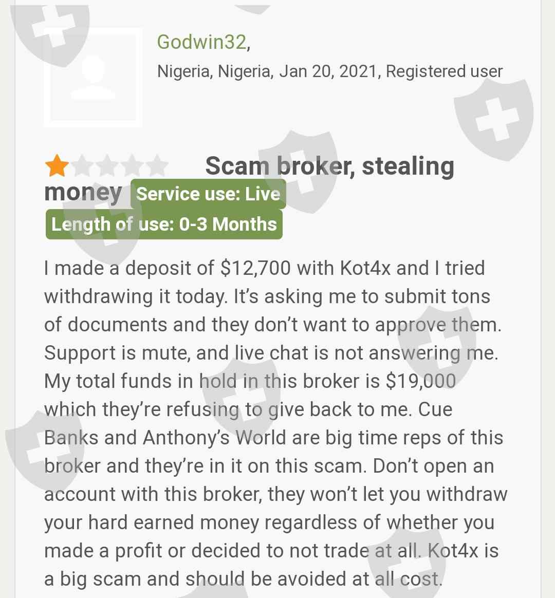 一位客户声称他无法从KOT4X当他向他们传达这个问题时,他们确实做出了回应。他已经警告其他人远离这个经纪人。