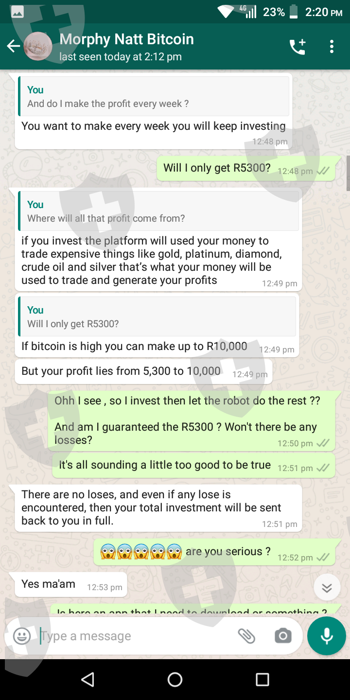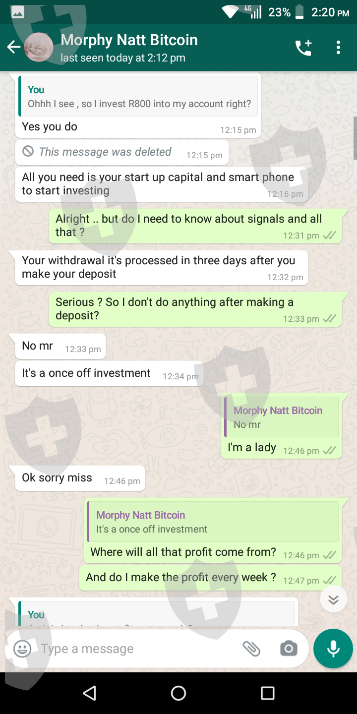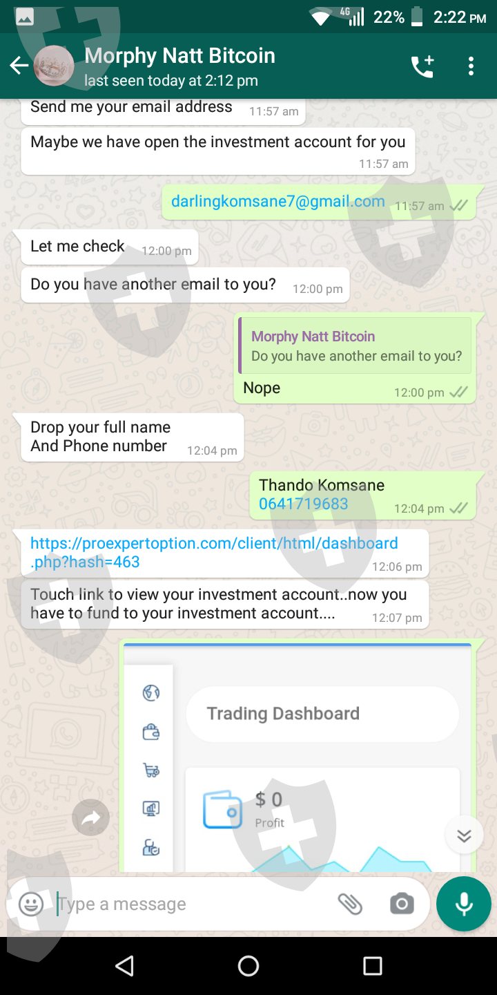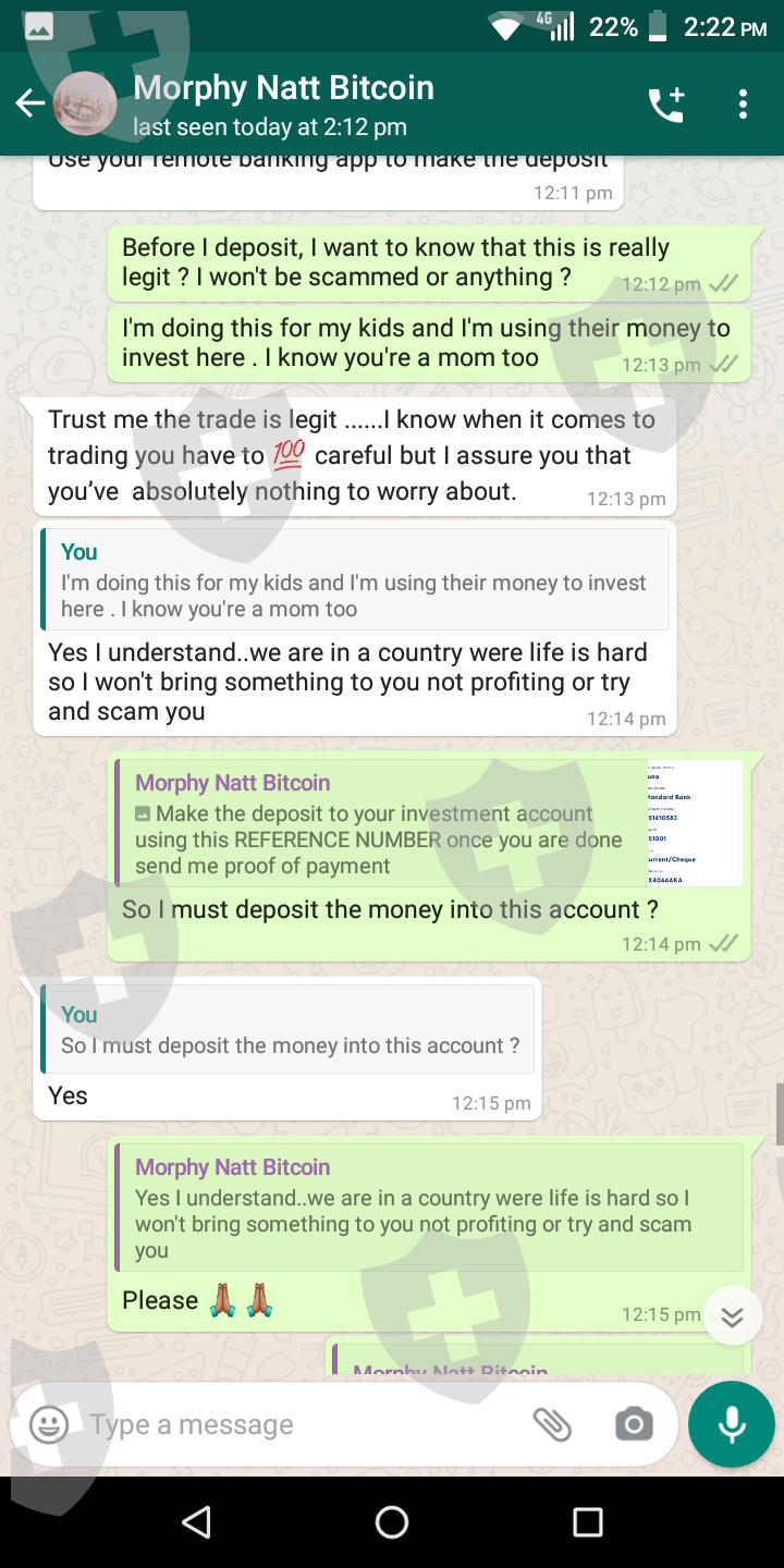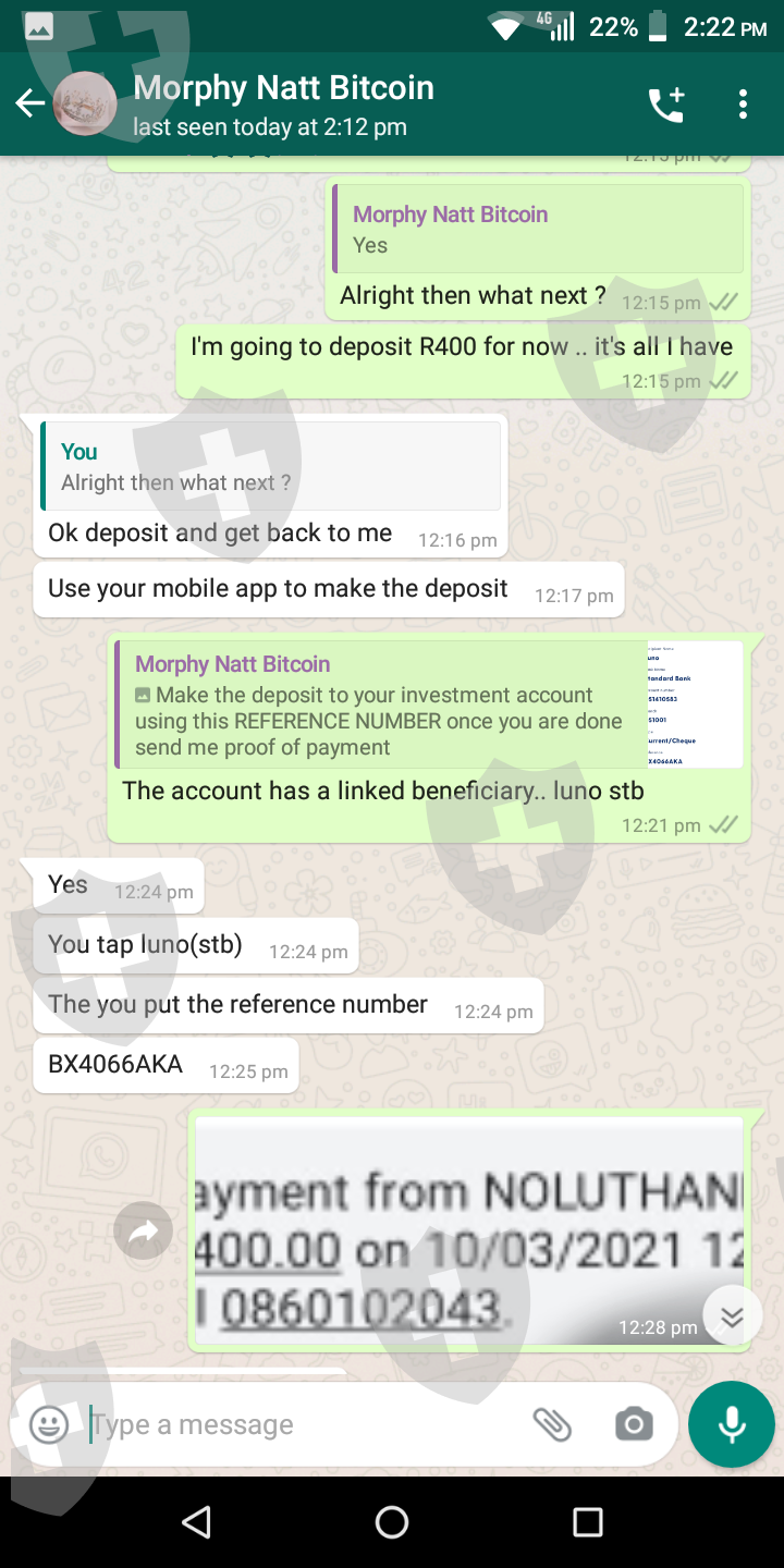 我叫 Thando,我被一个叫 Morphy 的人骗了。这一切都始于他在 Instagram 上给我发消息,声称自己是经纪人会计师。他向我解释说,他帮助人们每周赚 98 000 兰特。因此,由于我是一个迫切需要额外收入的单亲父母,所以我爱上了它。他跟我解释说,我只需要投资R3500,收到后付给他5%的利润。他给我发了评论截图。这一切看起来都是合法的,所以我去了。支付了我的投资后,他就走了。我试过无数次打电话给他,给他留了几条信息,但从那以后我就没有收到他的消息。他删除了他的 Instagram 帐户,就好像他根本不存在一样。我压力很大,因为他告诉我,我可以用钱投资我孩子的学费,等我收到付款时,我将能够为他们支付比我预期更多的学费。