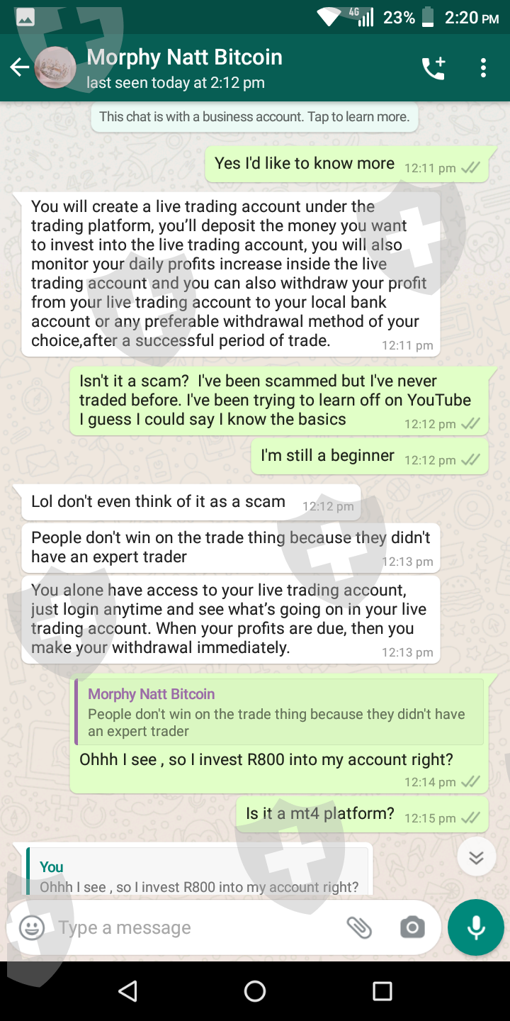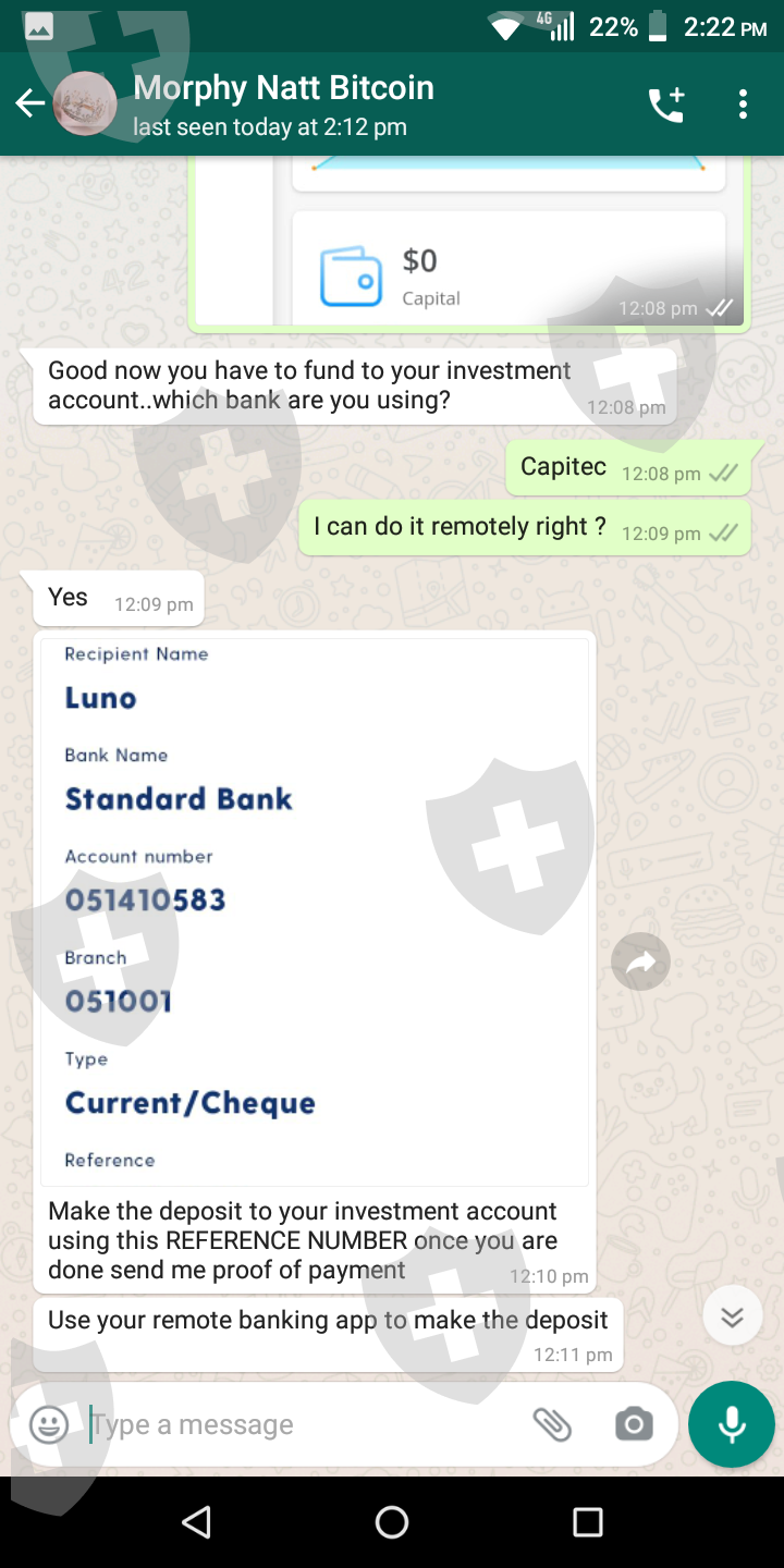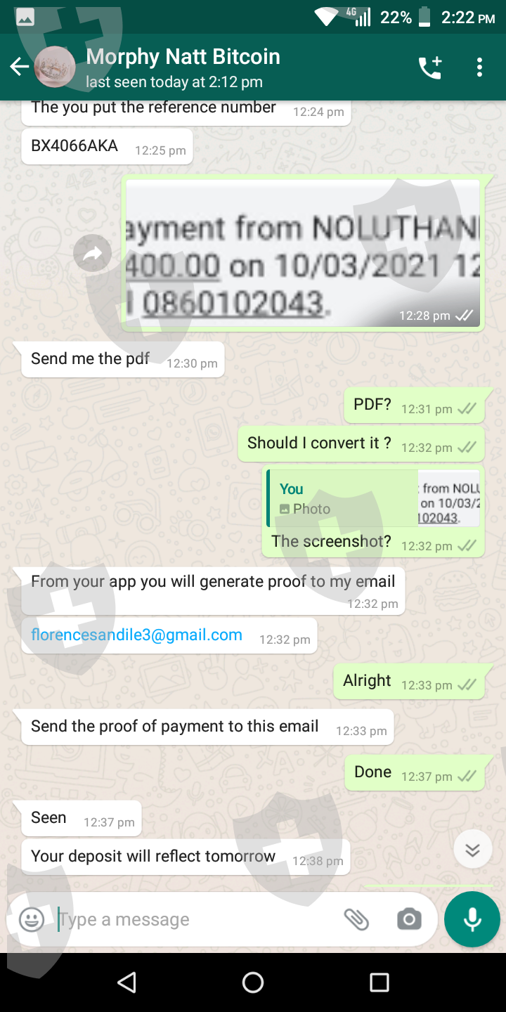 My name is Thando and I was scammed by a man named Morphy. It all started when he messaged me on Instagram, claiming to be a broker accountant. He explained to me that he helps people make R98 000 a week. So since I'm a single parent in desperate need of extra income, I fell for it. He explained to me that I only need to invest R3500, then pay him 5% of profits once I've recieved it. He sent me screenshots of reviews. It all looked legit, so I went to it for it. After paying my investment, he went quite. I tried calling countless times and left him several Messages but I haven't heard from him since then . He deleted his Instagram account , it was like he didn't even exist. I was so stressed out because he told me that I can invest my kids school fees money, by the time I get my payment I will be able to pay for their school fees more money than I expected.