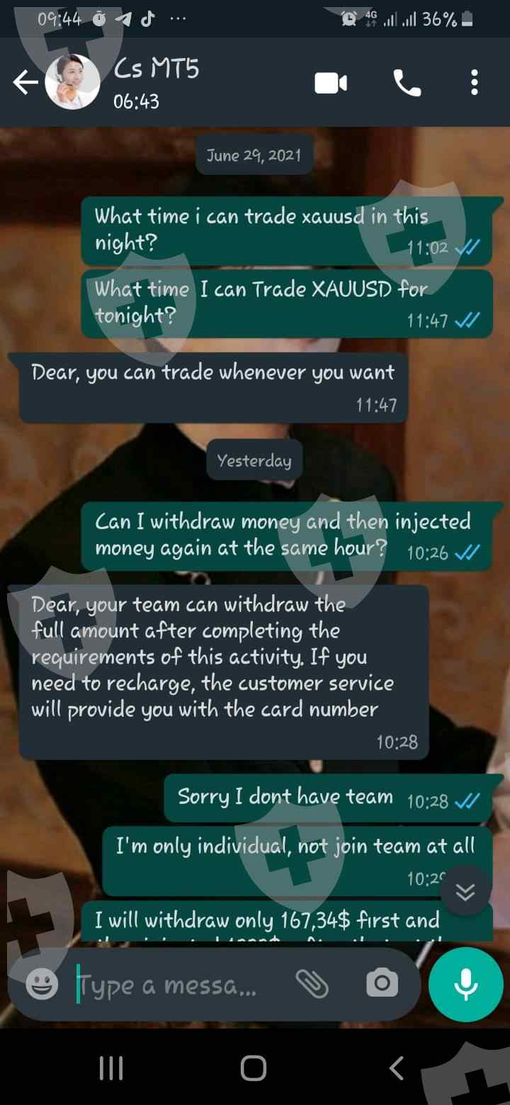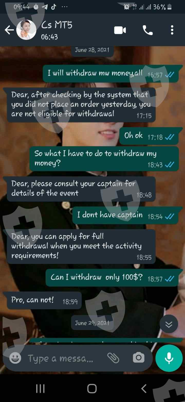 最初一切都很顺利,充值或提现都很顺利。直到2021年6月28日我想提现,不能,cs解释说我之前没有交易,必须提现前一天晚上交易,最后2021年6月29日晚上我交易,第二天问CS和CS说我没有资格退出,因为活动尚未结束,即使我从未参加过任何活动或被邀请参加任何活动。秒