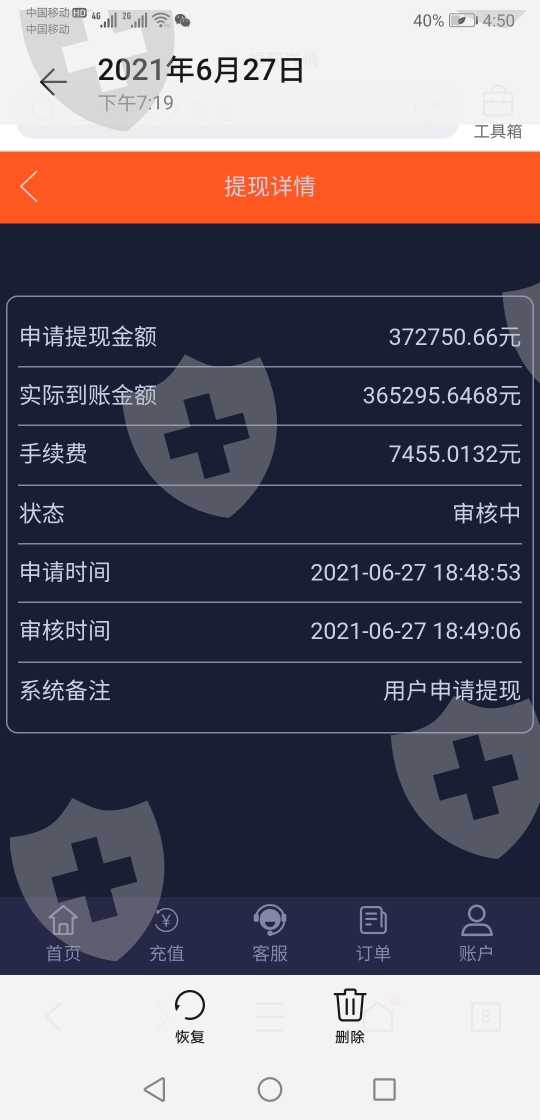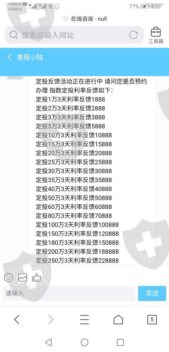 在平台上找客服充值买美国指数,然后让定投三十万反利三万零八百八十八,定投完成就可以提现了。提现后一直没到帐,问客服说是银行系统延时,被第三方平台银监会监测到冻结,需补交帐户金额一半,就能提现。可我认为是骗局