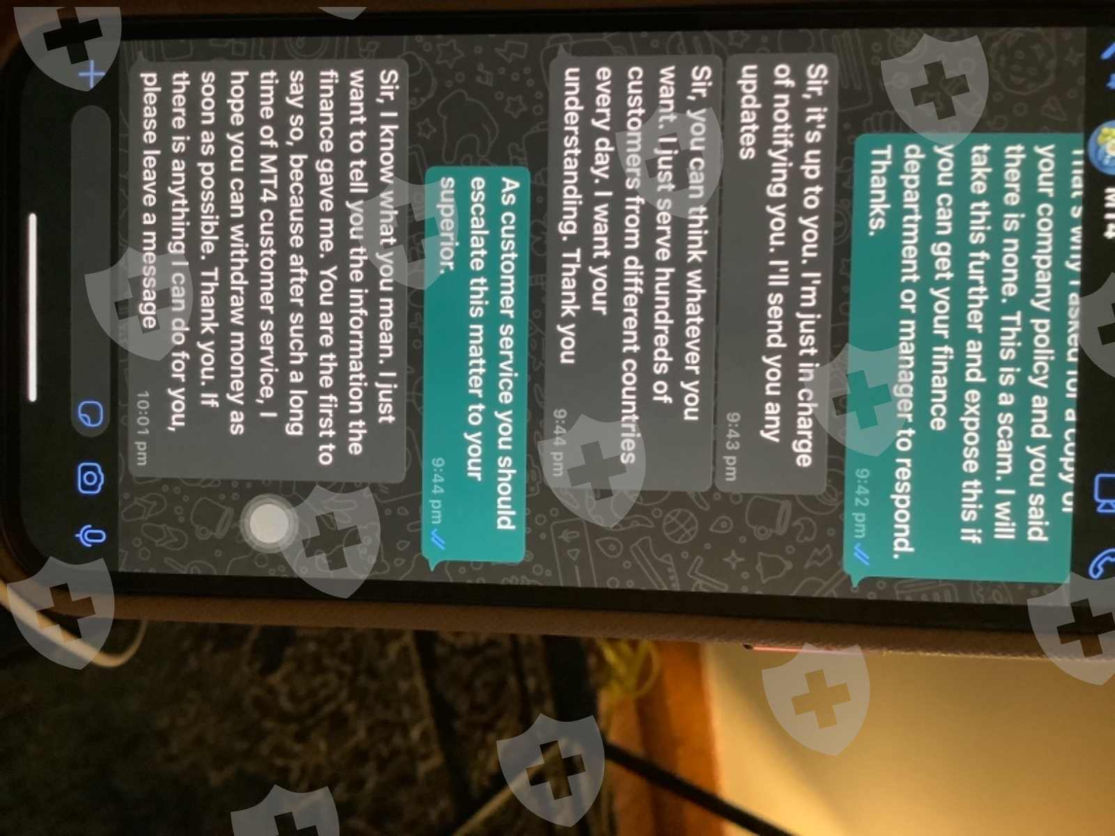 Mkj or MT4 customer service sent a message on WhatsApp informing me that the funds have been remitted and sitting in a bank waitingfor the 20% deposit and if the payment is not received then all the funds will be absorbed by them. I have requested multiple times for a company policy as a reference and they said there is none. How does one know about these rules when they haven’t been informed at thepoint of registration and account activation? They refused to escalate this to their manager and kept claiming that they are just passing on the message from their finance department. I also requested for evidence on this and they ignored my request and kept saying that this is the process. The guy that got me into this conveniently had some remittance receipts to show me when I told him about my situation. However the screenshots weren’t in full and it doesn’t make sense. So it could be true or false. There is no head or tail to know if it is real. He tried to convince me that it’s legit and that we should find a way to get the funds out. He offered to pay $5K USD and that i have to find the balance myself. I did not ask for his help in the first place and I can’t help but think that he is still trying to play innocent and scam me further. Please can I get some assistance in resolving this?