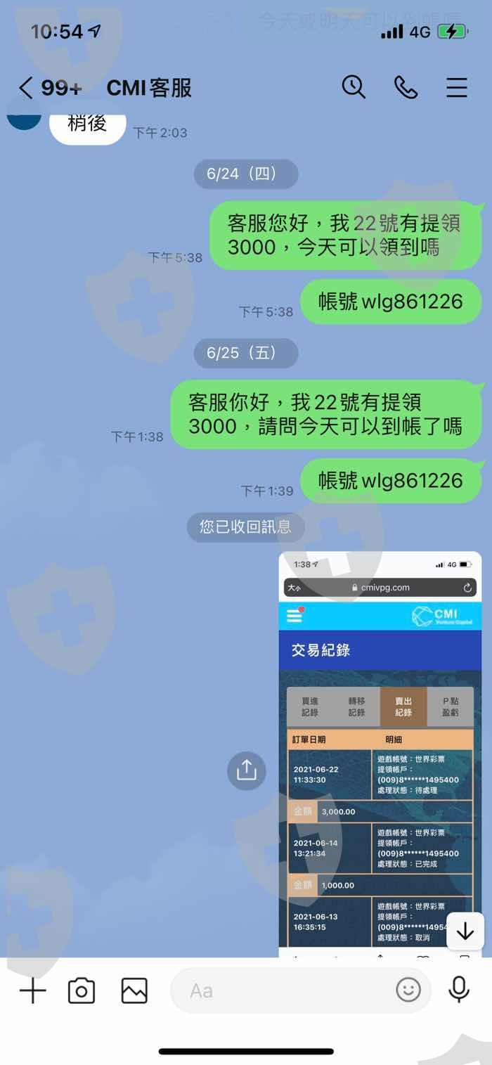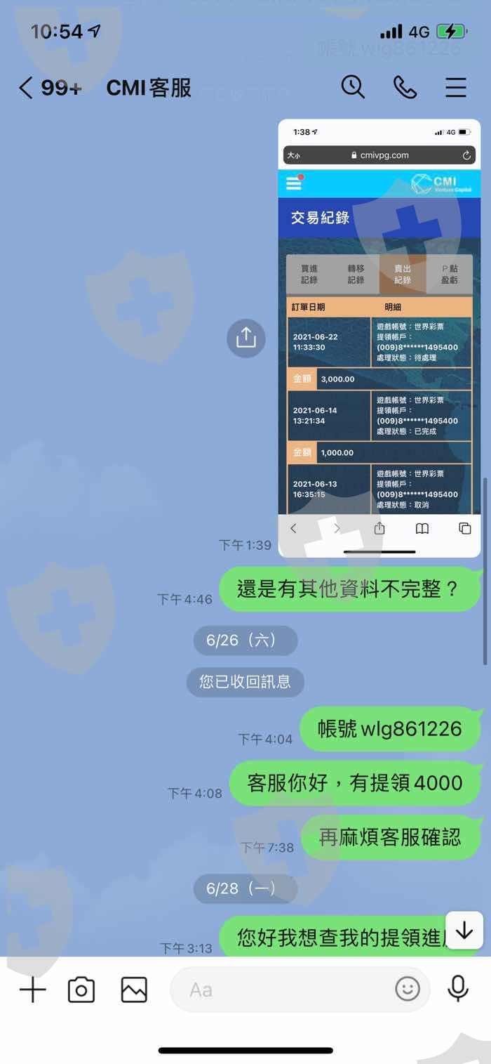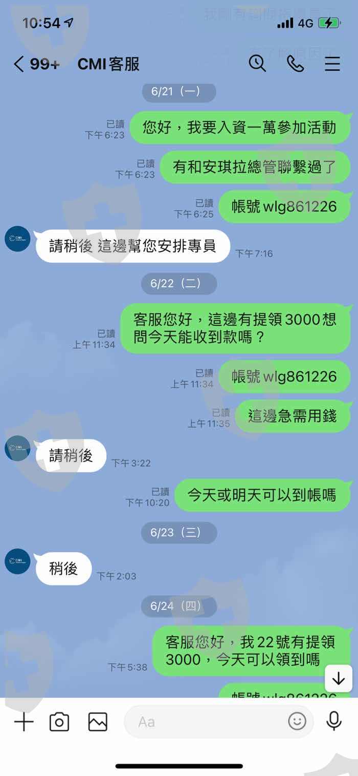 一開始投一千進去賺了五千後,把本金一千提領出來可以領,之後剩的錢就繼續和群組帶單慢慢賺,直到我想將部分錢提領時,客服就是不回應也不處理,群組內的分析總管也是,當初說什麼我中了他們程式部門六月紅利名額,可以用較少的資金投資(他們活動正常都要10萬),所以當我得知這個消息時我就很興奮,心想我終於可以賺多一點錢了,所以我投入了一萬之後,總管也說會幫我安排,等了好幾天都不見總管回覆,我又在大廳群組回應此事,就詢問其他學員有沒有其他人聯繫到總管的,但其他人都說有,我就很納悶了,是我投入了錢就不想甩我,結果沒多久總管就回我了,說抱歉抱歉最近太忙訊息太多,後來才開始幫我安排帶單,但她說一對一帶單必須退出原本的大廳群組,結果跟我約好時間準備要開始操作了,人就不見蹤影,等了好幾天還是沒回應,我就徹底放棄了,所以提醒正想投資的你們,不要盲目的投資,確認好這個投資是否安全再下決定,可以多詢問朋友親人或是防詐騙專線165。