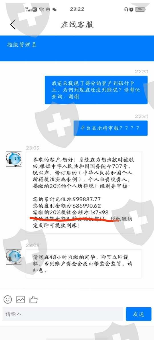 一个网友给我以下链接,告知平台有个7天定存活动,每天将返利3%,然后在返利后+当天的本金合计总金额的基础上再充值20%到平台继续返利,定存活动结束后,被告知需缴纳收益部分的20%且税务部审批后才能提现,而且平台可帮忙代缴或自己交税务部,嫌麻烦就让平台代缴了13万多的税收。在整个参与的过程中,我入金充值了30多万,而且都是网贷的,因我没有多的资金,这个网友前前后后总共帮我充值了40多万(含缴纳税收),就因此举动,见他帮我充值比我自己充值了还多,我就没怀疑他。缴纳税收后的第二天,他说近几天有点忙,可能会少些联系我了,第三天就联系不上了。而我每天关注到平台审批税收后的通知提现以便我还网贷,结果即将一周过去,还是显示待审批,三番五次追问客服那边也没有回复。我才恍然大悟自己是不是被套路给骗了?这个网站是不是不是正规平台?投资的30多万可全是我借的各种网贷,这么多钱可是我们普通人半辈子的心血啊,也不敢让父母知道。跪求求各路高手指点,还我公道如何追回资产?万分感谢,好人一生平安幸福!