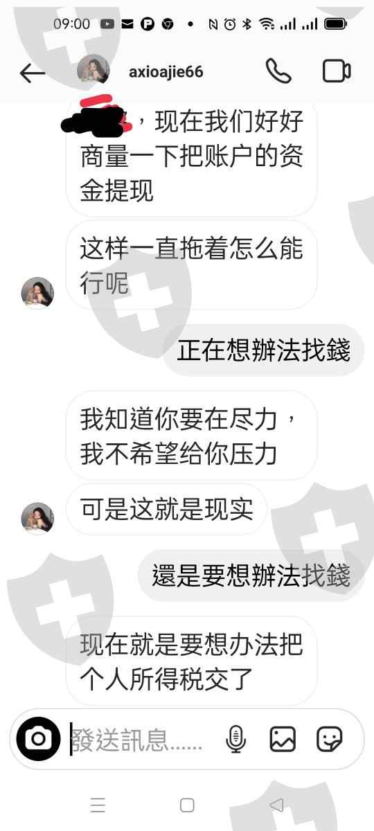 一開始推薦這平台加入是她,說會帶著我這新手小白賺錢且出入金快速隨時可提現還是她,賺到盈利了要出金提現,說要繳20%個人所得稅也是她,現在次次催促籌錢繳稅說我一拖再拖又是她,對話裡只有週轉籌錢湊錢借錢,搞得好像是我欠她的一樣,到底有沒有搞錯,不是說隨時都可提現,出金前還要多坑幾筆嗎?繳稅?賬戶凍結?保證金?匯率手續費?然後出金審核未過還是無法提現!