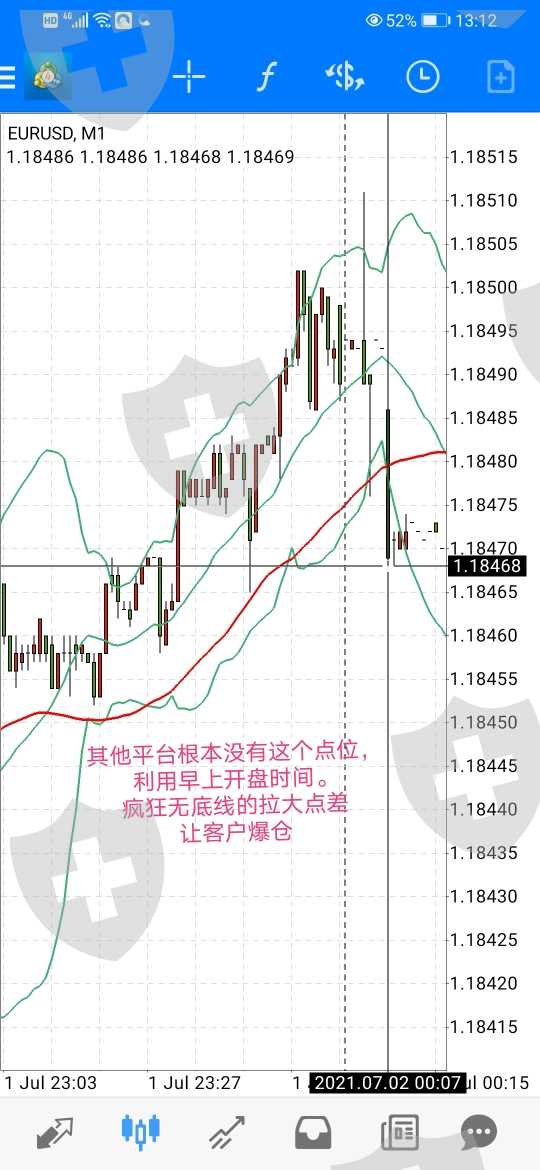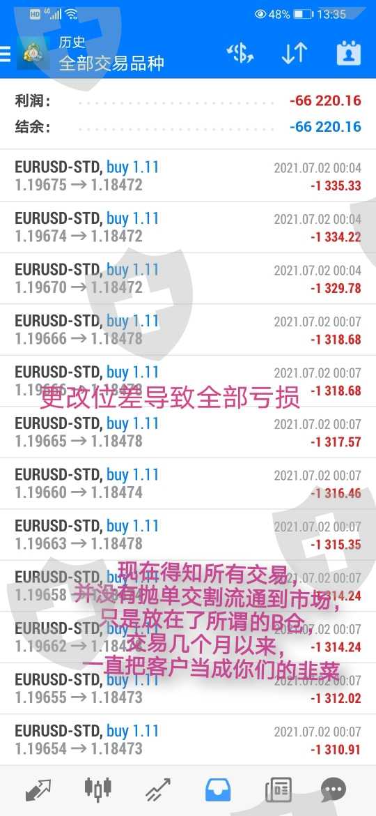 浦华金融Prospero平台,在2021年7月2日大盘时间0:07分故意改动点位,导致客户爆仓,直接损失6万多美元,这个点位,其他平台根本没有。没有的点位,出现在了大盘上,呵呵了,可以去查看其他正规平台,开盘时点差一度到了120点左右。无底线拉大点差,平台协商赔偿2万美元。还美其名曰,是照顾客户的感受,在这里我谢谢你,把账户放到B仓,就没打算让客户盈利出去,口口声声说是正规平台,公开透明,不坑交易者,背后却私自改动点位,让客户爆仓,居心叵测,请交易者注意