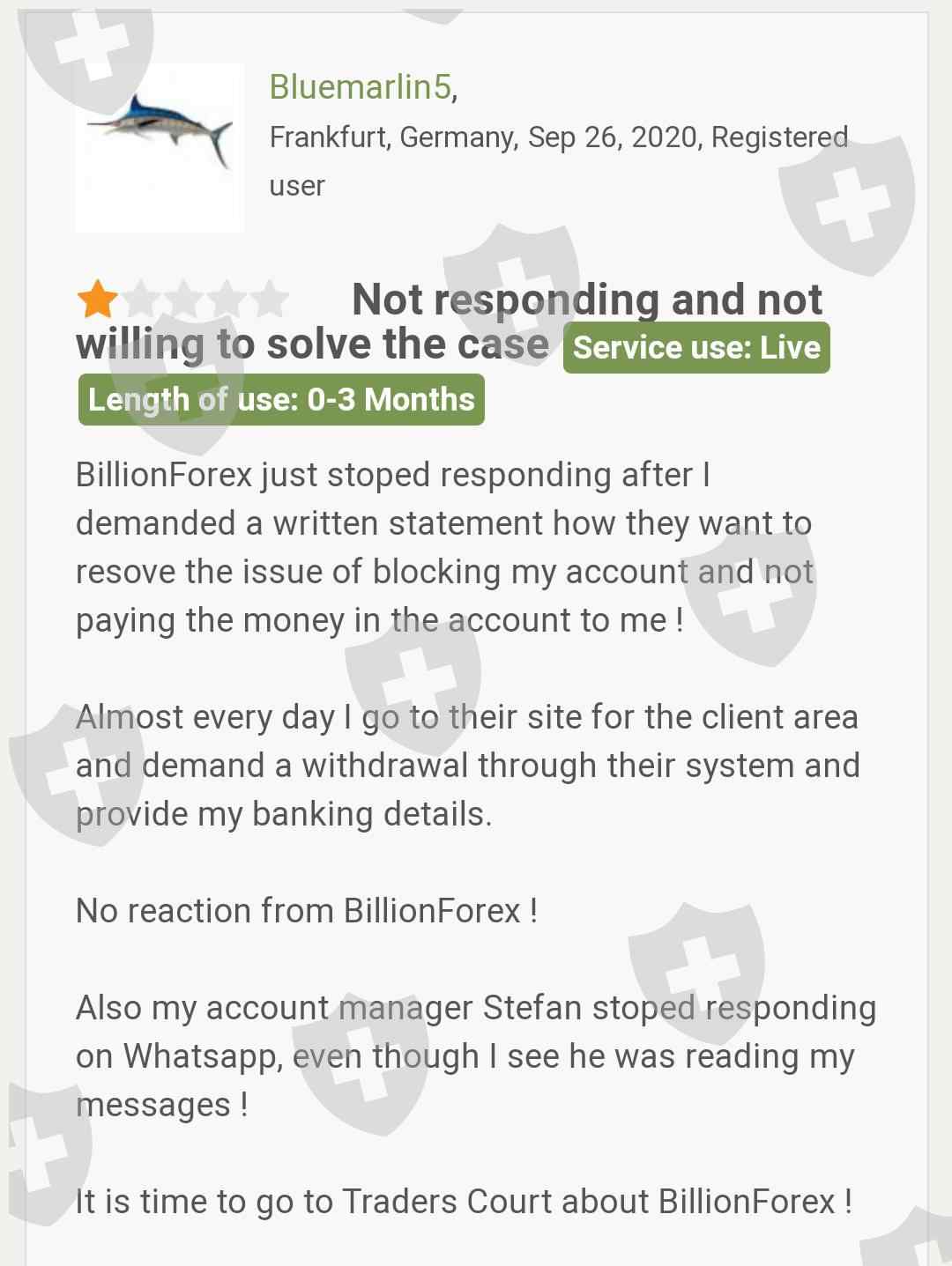 Billion Forex通过拉黑客户的帐户并且不回应他的出金申请来欺骗客户。客户想起诉该交易商。