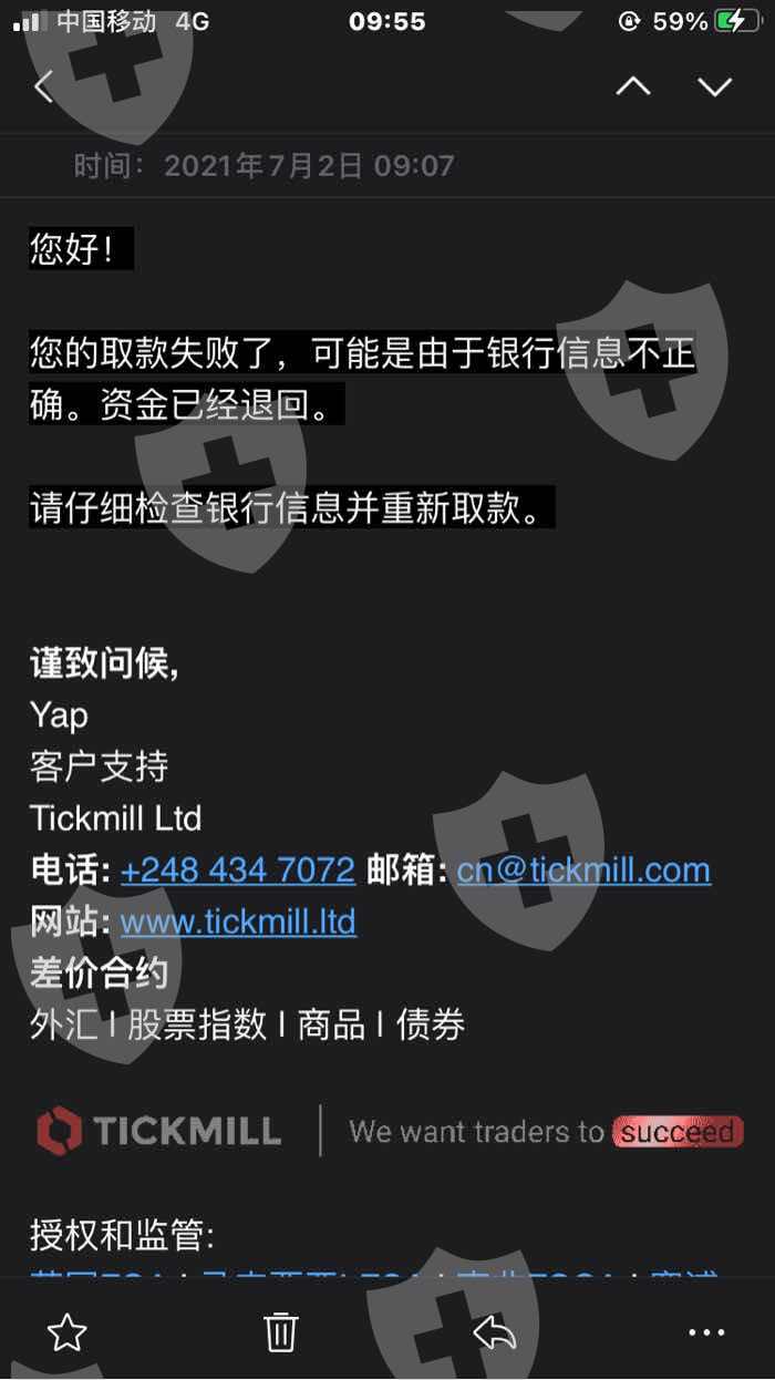 我是从6月23号申请一笔取款到今天7月8号已经有了半个月时间了,一个取款还没有到账,联系了客服、官方邮箱,都各种理由不给出金,我之前入金很多次了,取款时用的还是那张银行卡号,缺给的回复银行卡信息错误,换了银行卡,换取款方式都试过了好多次、我总算看出来了是黑平台,大家远离这个平台. 域名:tickmill .ltd