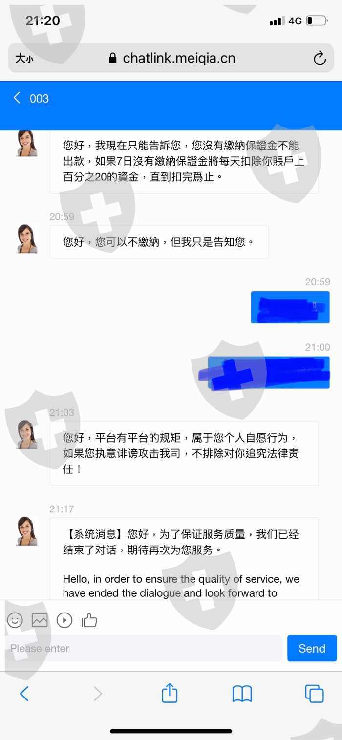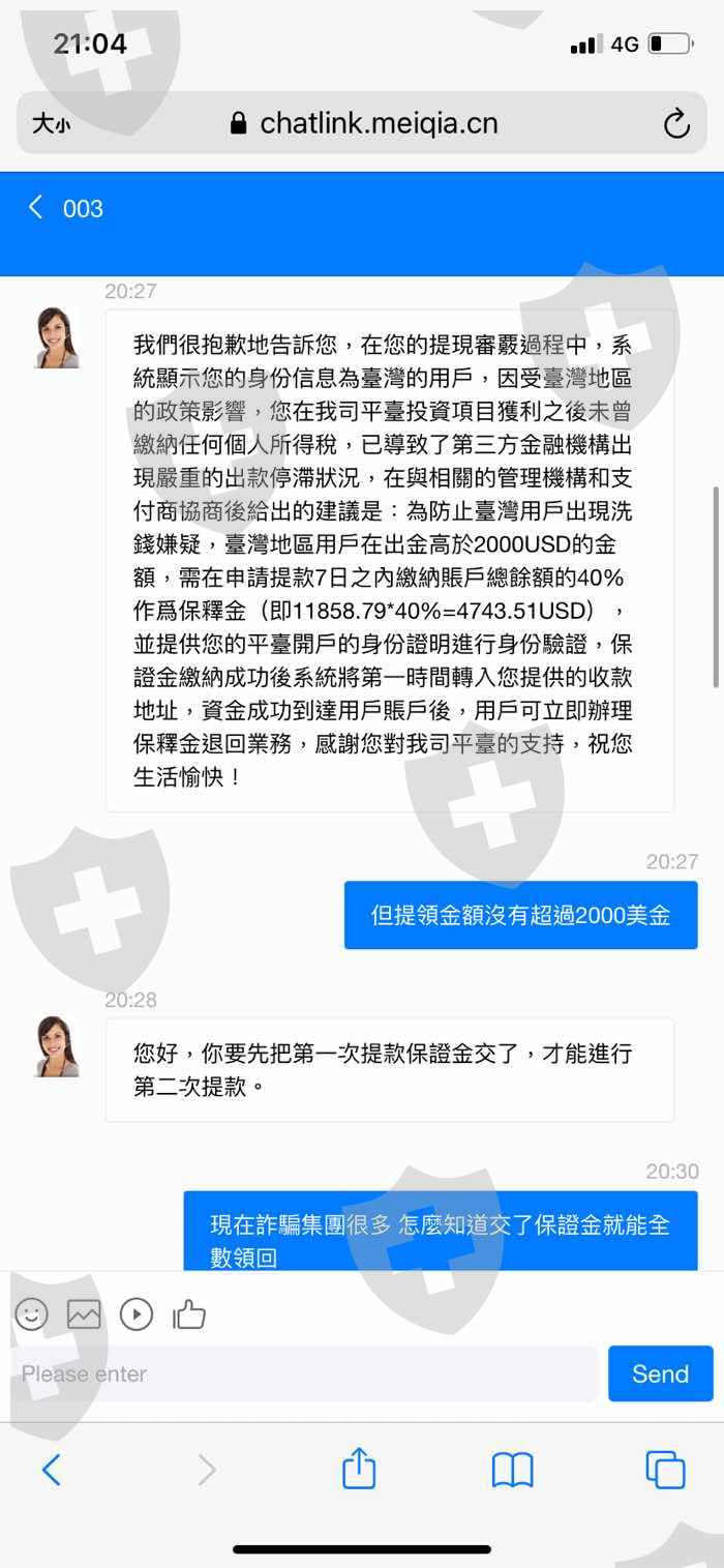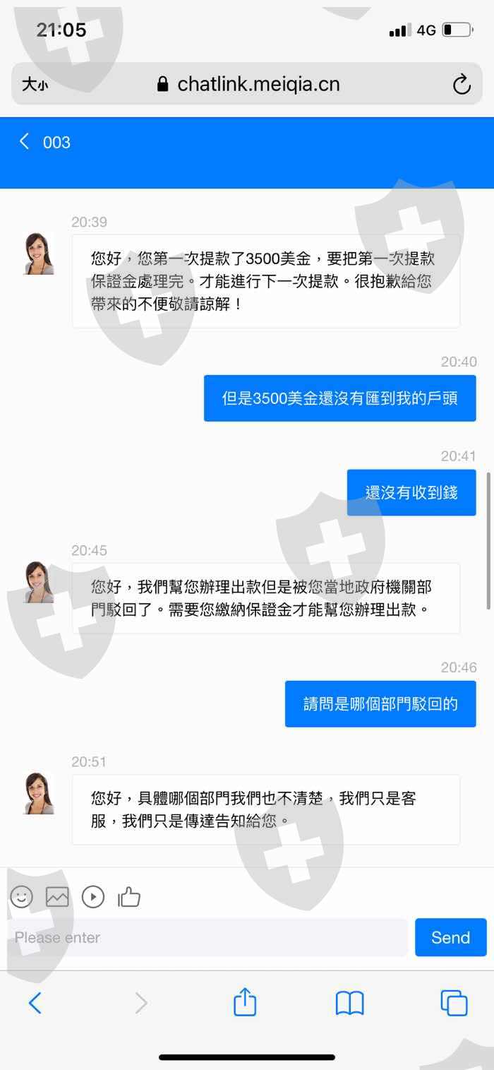 客服人員說台灣政策問題沒辦法提款超過2000美元 要全額拿回須先繳交保證金