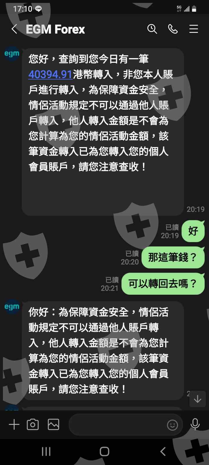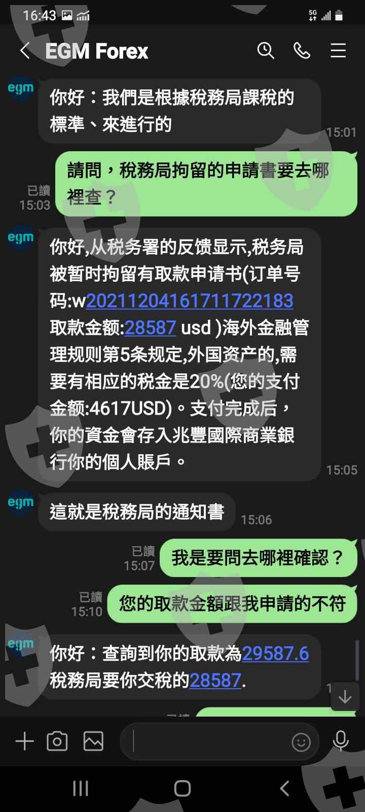 交友軟體Lemo ID:7769653 ,LINE ID :feng9891,因了解彼此的遭遇相似,以老公老婆相稱,要我相信他做外匯投資【egm forex】,有保法律援助7000美元,出金可現提;最低門檻500美元(台幣15000元),以1:30對換,起初沒錢只付了200美元(台幣6000元),其餘他幫我300美元,後來建議本金要多才能避開爆倉的風險,借錢投了500美元(台幣15000元),再借錢投1000美元(台幣30000元);過沒幾天,他說有一個情侶活動想跟我參加5200美元,他說想要贈送的儲值金,一方面幫自己一方面幫我,我說我沒錢,他居然說要幫我儲值,結果客服說不是我本人名義匯款不列入活動範圍,我要客服匯款還給他,結果客服居然入在我的帳戶,什麼都是事後才告知,說這個活動一旦開始,兩個人都不能出金轉出,後來怕他也跟我一樣無法出金,就借保險去匯了5200美元(台幣156000元)。還規定活動期間要跑完30%流水才能解除彼此出金問題,結果出金後第三天,客服說有稅務問題,要隔天問客服,說稅務局扣留我取款申請書,說要扣20%稅金,要先支付才能出金嗎?