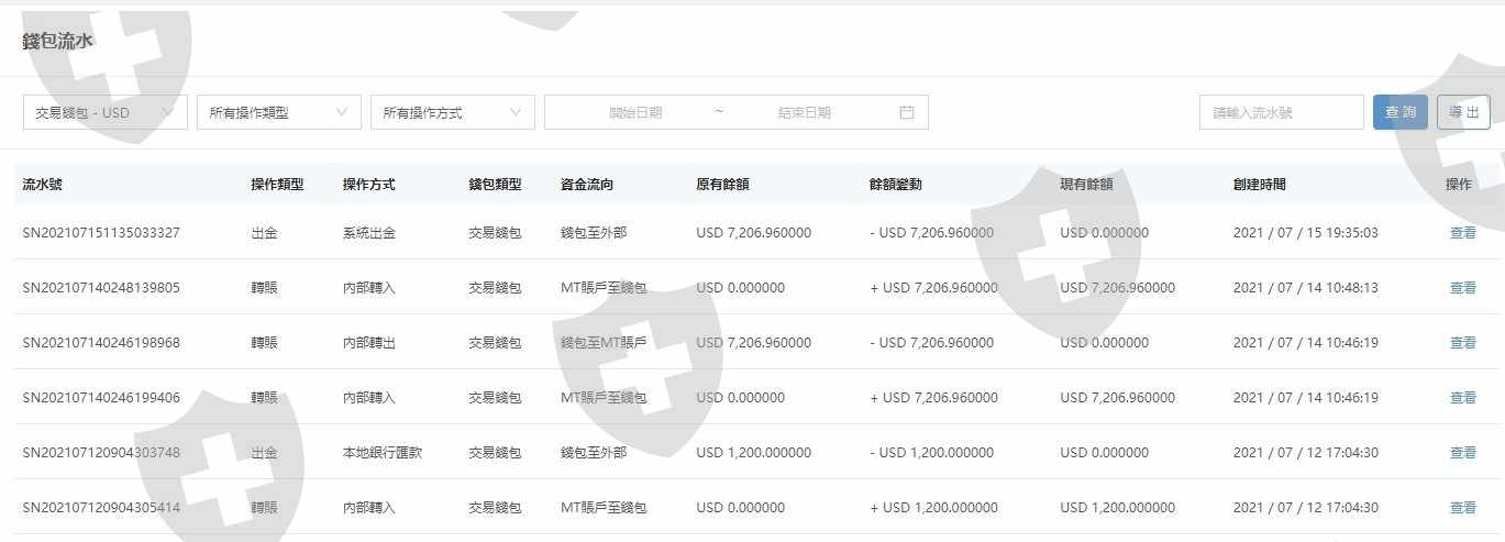當天就領到1200USD的出金了,領到出金的當晚我的帳戶剩下的7200USD也被他們清空了我根本都沒提領,如圖,我最後一次出金審核是1200USD然後我帳戶的流水被他們用一筆系統出金扣了7200USD如果是我自己出金的話應該會是用本地銀行匯款的方式轉至我的帳戶