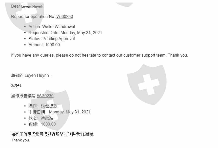 申请出金后,我向该经纪人发送电子邮件以确认请求,状态为待批准,但 21 天过去了状态仍是待批准,经纪人没有联系或回复。我的电子邮件:huyquocluyen584@gmail.com 无法撤回出金请求。支持人员一直报告提现渠道从5月31日到现在处于维护状态。 请注意他们还创建了如下其他虚假交易所: