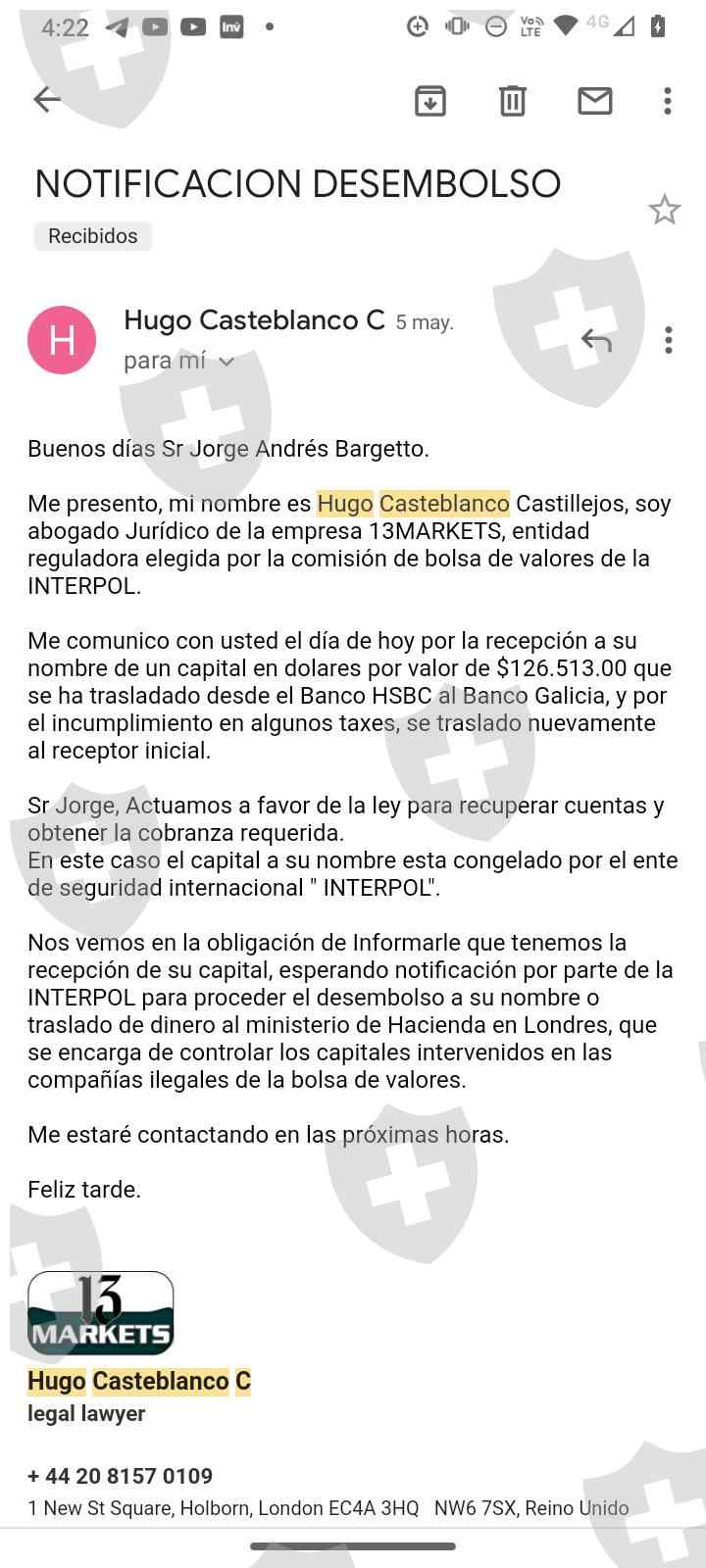 Empresa 13 Markets me tiene capturado mi dinero me hizo abonar enviándome documentos de interpol, HSBC FCA para creer que era una gestión de devolución pero todo lo que gestionaban los ejecutivos Hugo Casteblanco, Sebastian Salazar, Angela Vega. era falso.