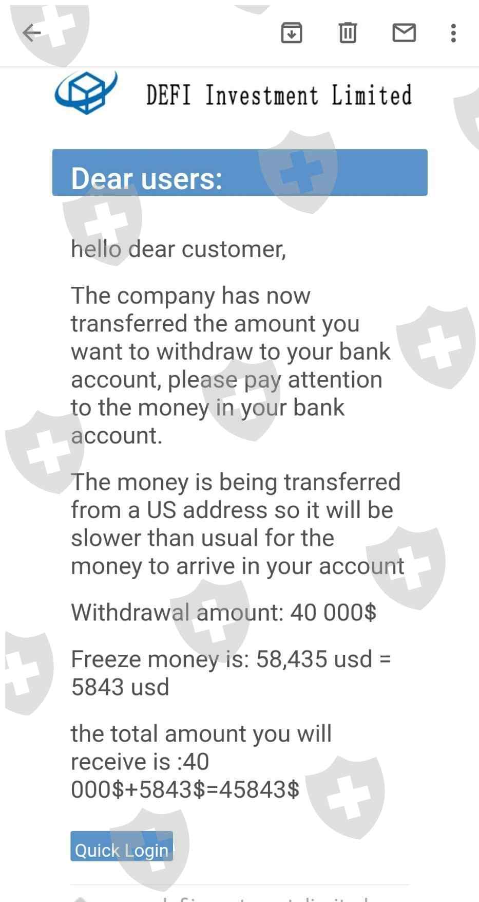 Defi's customer servic3 asked me to pay income tax and de-icing fee. total about 30% of my profit but the money still not wire to my account as their informed