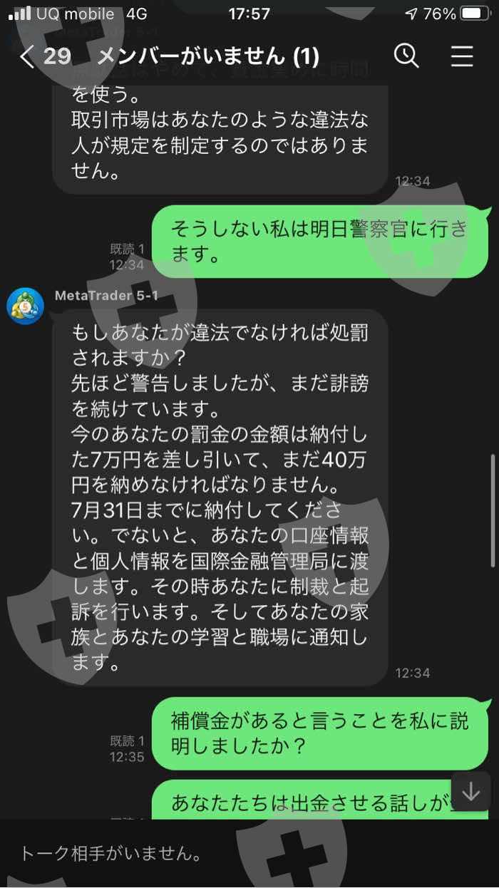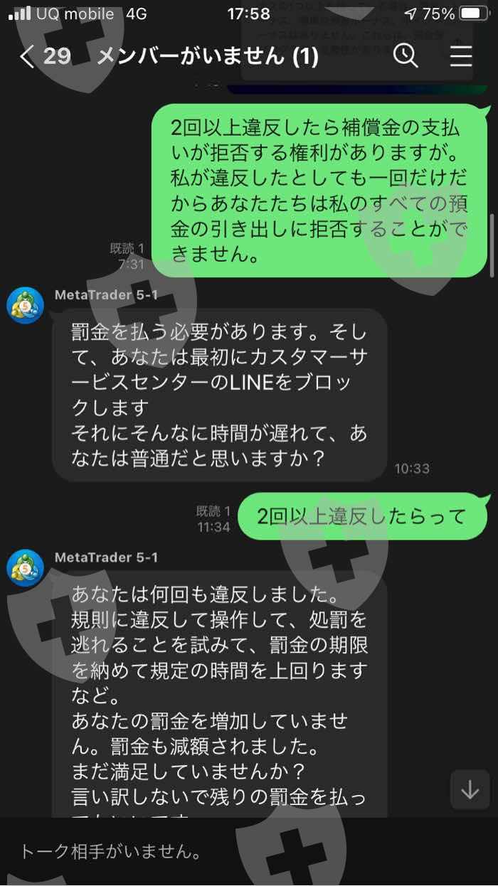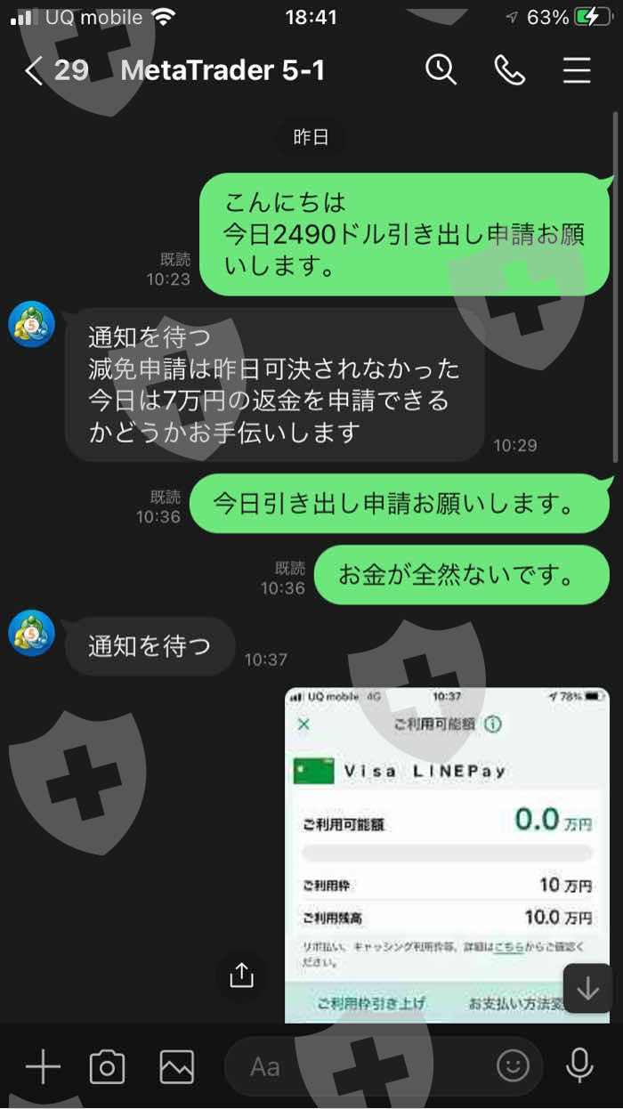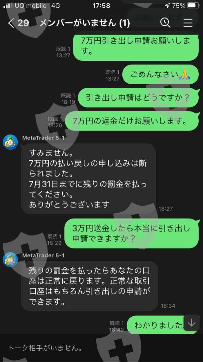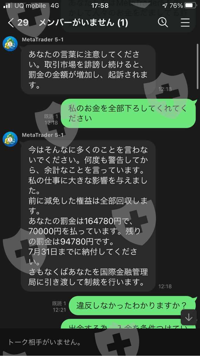 使用 MetaTrader 5 应用程序ShineTrader- 我被邀请以 Live 的名义投资外汇,我首先转移了 110,000 日元。我用 110,000 日元的基金经营。当时我拿到盈利申请提现,我就操作了。我被告知冻结我的账户,但没有告诉我如果我在提款时操作它会被罚款,并且如果我发送$ 1498的罚款,我可以申请提款我的账户中的钱。提款申请也被拒绝。在没有解释投资外汇的规则的情况下,他没有在罚款的情况下提取我的钱。所以当我决定支付罚款并要求他调低金额时,他告诉我应该支付10万日元的罚款。由于 10 万日元对我来说很多,所以我申请了 7 万日元的减免申请。当时,我被告知如果我提前支付了70,000日元,我会申请减免,所以我寄了70,000日元。汇款完成后,因为7万日元豁免申请失败,我被告知要汇出剩余的3万日元。我没有再寄钱,因为我没有钱。没有解释规则就被追查罚款