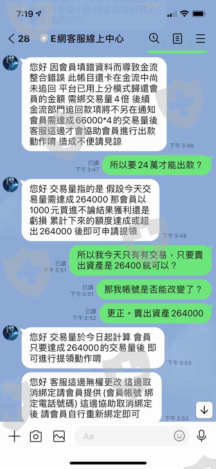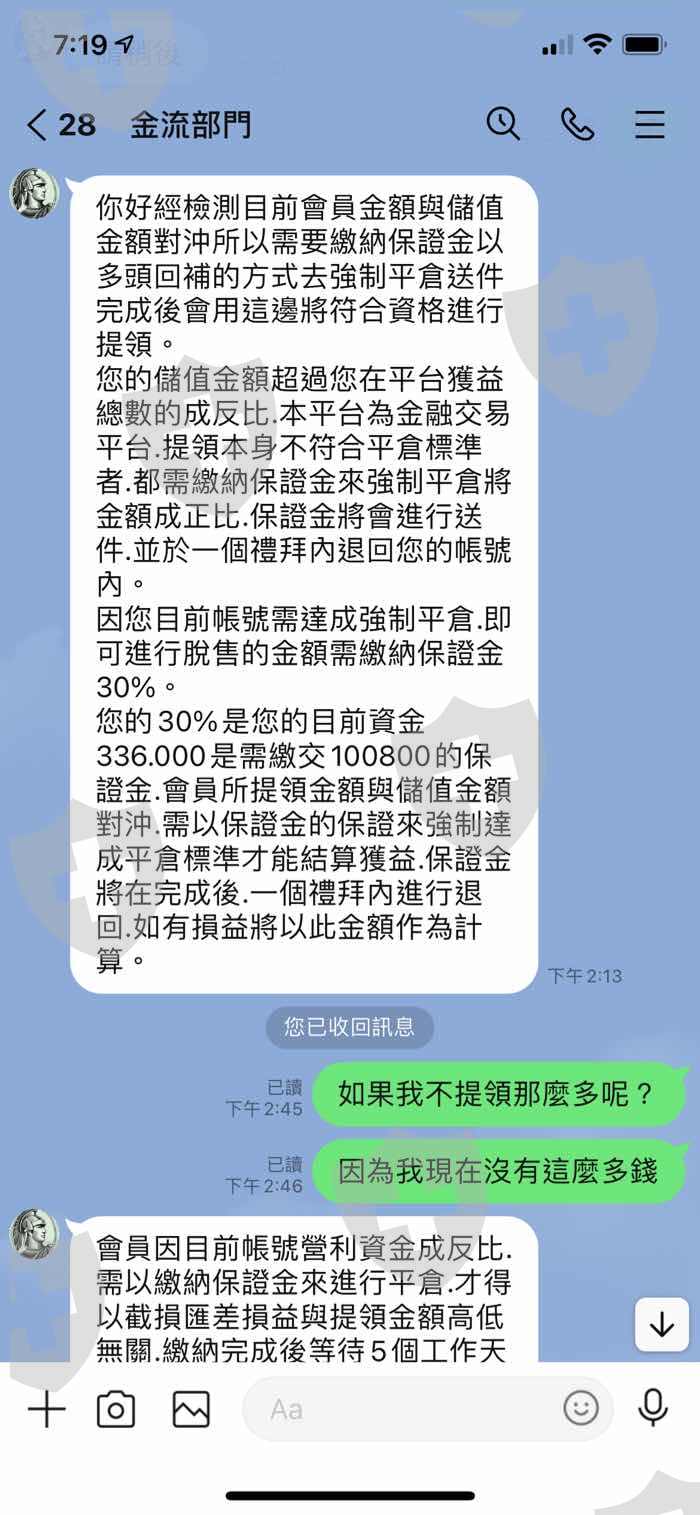 一開始是有人說要應徵助理代操,代操幾天說無法再聘用,後來說要給我名額彌補我投入本金3萬第一次說帳戶錯誤,鎖3天,已付佣金4萬第二次說要達到交易量才給出金,已付佣金9萬,申請提領竟然說要付保證金11萬現在身上沒錢支付保證金