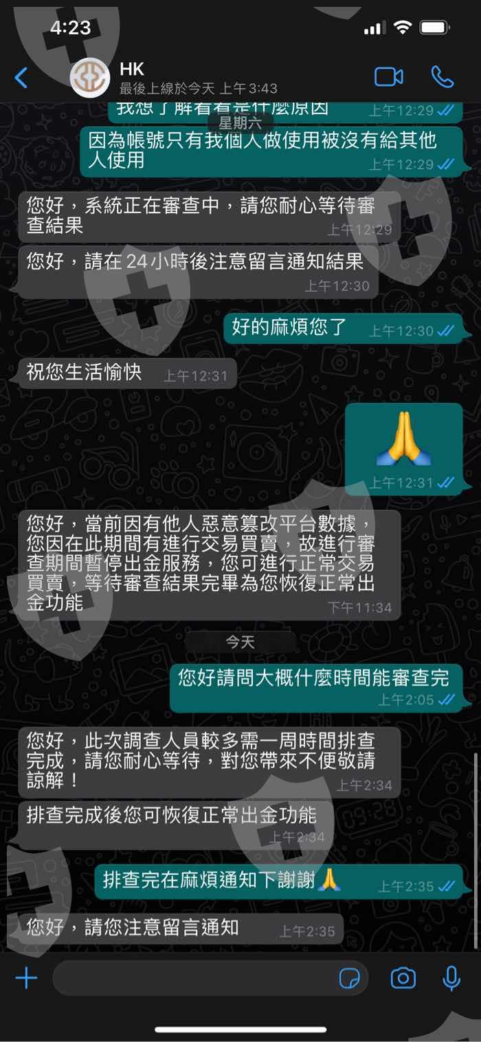有一筆申請出金提款客服遲遲沒有回應並作廢我的提款申請未主動通知不能出金的理由還要一直主動去追問才以得到回覆以下為客服說明不能出金的原因